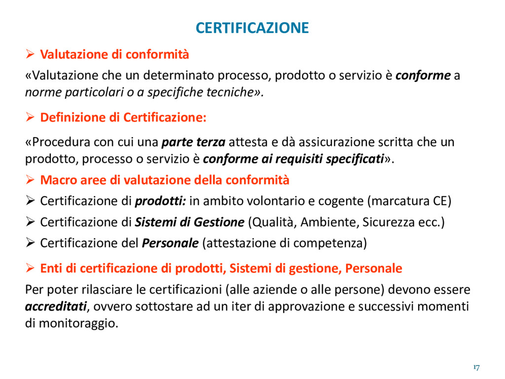 prodotto o servizio è conforme a norme particolari o a specifiche tecniche». Ø Definizione di Certificazione: «Procedura con cui una parte terza attesta e dà assicurazione scritta che un prodotto, processo o servizio è conforme ai requisiti specificati». Ø Macro aree di valutazione della conformità Ø Certificazione di prodotti: in ambito volontario e cogente (marcatura CE) Ø Certificazione di Sistemi di Gestione (Qualità, Ambiente, Sicurezza ecc.) Ø Certificazione del Personale (attestazione di competenza) Ø Enti di certificazione di prodotti, Sistemi di gestione, Personale Per poter rilasciare le certificazioni (alle aziende o alle persone) devono essere accreditati, ovvero sottostare ad un iter di approvazione e successivi momenti di monitoraggio. 17