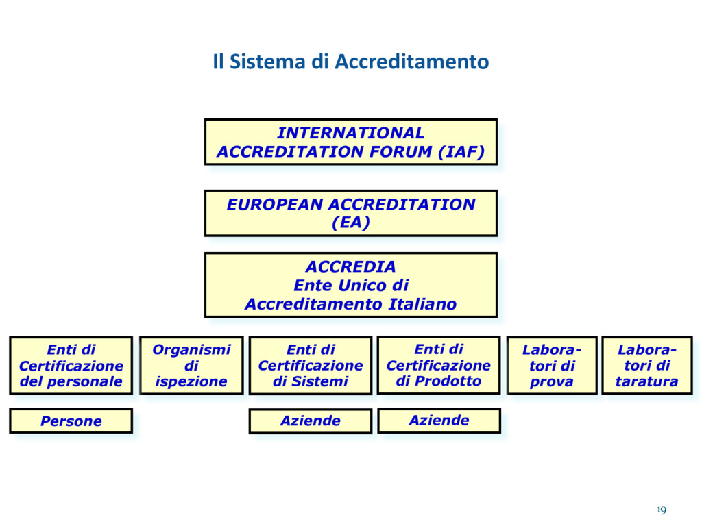 Certificazione di Sistemi Enti di Certificazione del personale Labora- tori di prova Labora- tori di taratura Enti di Certificazione di Prodotto ACCREDIA Ente Unico di Accreditamento Italiano EUROPEAN ACCREDITATION (EA) INTERNATIONAL ACCREDITATION FORUM (IAF) Aziende Aziende Persone