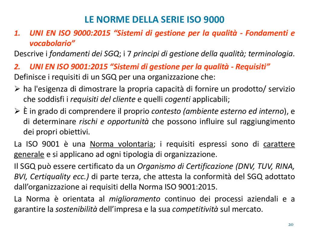 9000:2015 “Sistemi di gestione per la qualità - Fondamenti e vocabolario” Descrive i fondamenti dei SGQ; i 7 principi di gestione della qualità; terminologia. 2. UNI EN ISO 9001:2015 “Sistemi di gestione per la qualità - Requisiti” Definisce i requisiti di un SGQ per una organizzazione che: Ø ha l'esigenza di dimostrare la propria capacità di fornire un prodotto/ servizio che soddisfi i requisiti del cliente e quelli cogenti applicabili; Ø È in grado di comprendere il proprio contesto (ambiente esterno ed interno), e di determinare rischi e opportunità che possono influire sul raggiungimento dei propri obiettivi. La ISO 9001 è una Norma volontaria; i requisiti espressi sono di carattere generale e si applicano ad ogni tipologia di organizzazione. Il SGQ può essere certificato da un Organismo di Certificazione (DNV, TUV, RINA, BVI, Certiquality ecc.) di parte terza, che attesta la conformità del SGQ adottato dall’organizzazione ai requisiti della Norma ISO 9001:2015. La Norma è orientata al miglioramento continuo dei processi aziendali e a garantire la sostenibilità dell’impresa e la sua competitività sul mercato. 20