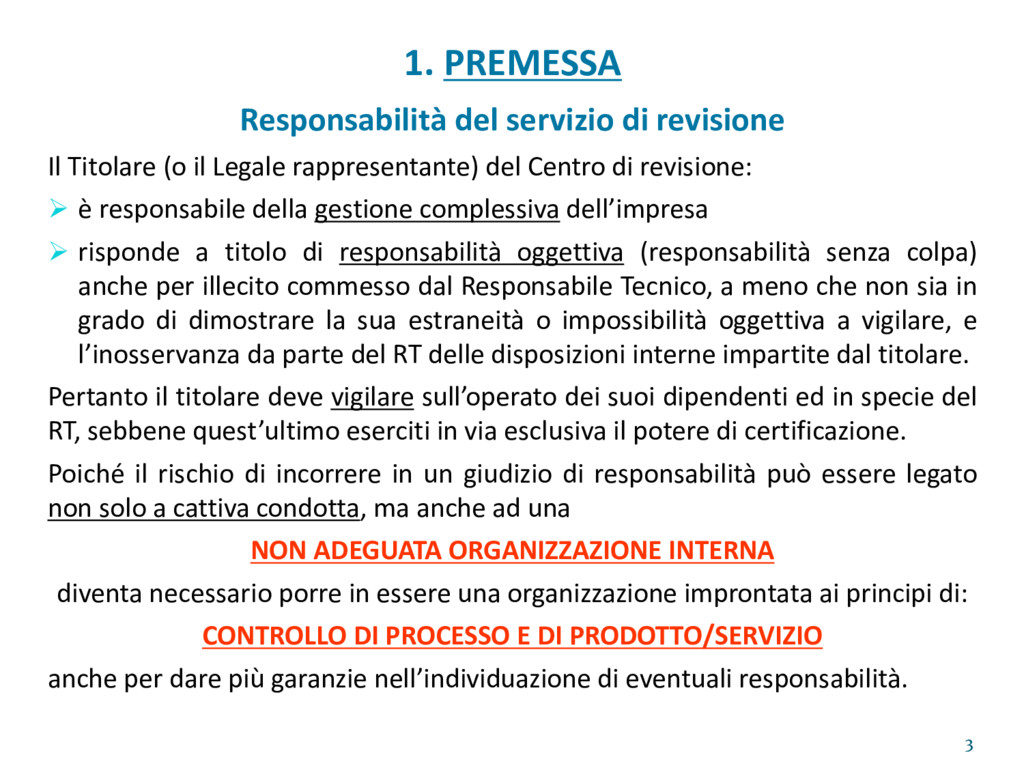 il Legale rappresentante) del Centro di revisione: Ø è responsabile della gestione complessiva dell’impresa Ø risponde a titolo di responsabilità oggettiva (responsabilità senza colpa) anche per illecito commesso dal Responsabile Tecnico, a meno che non sia in grado di dimostrare la sua estraneità o impossibilità oggettiva a vigilare, e l’inosservanza da parte del RT delle disposizioni interne impartite dal titolare. Pertanto il titolare deve vigilare sull’operato dei suoi dipendenti ed in specie del RT, sebbene quest’ultimo eserciti in via esclusiva il potere di certificazione. Poiché il rischio di incorrere in un giudizio di responsabilità può essere legato non solo a cattiva condotta, ma anche ad una NON ADEGUATA ORGANIZZAZIONE INTERNA diventa necessario porre in essere una organizzazione improntata ai principi di: CONTROLLO DI PROCESSO E DI PRODOTTO/SERVIZIO anche per dare più garanzie nell’individuazione di eventuali responsabilità. 3 3
