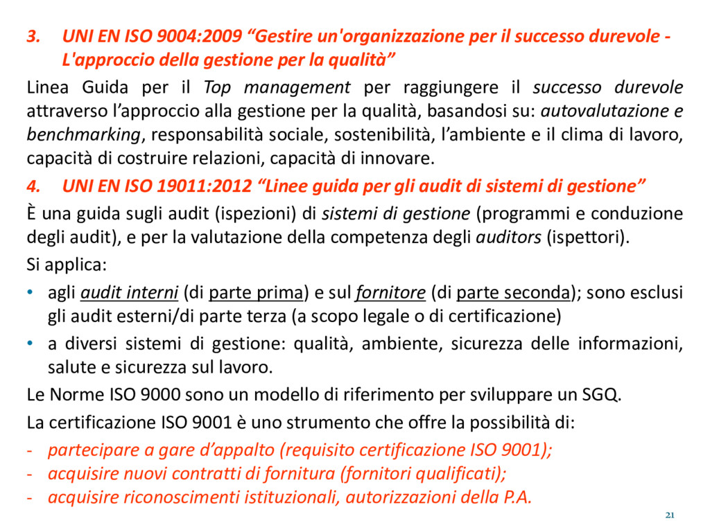 durevole - L'approccio della gestione per la qualità” Linea Guida per il Top management per raggiungere il successo durevole attraverso l’approccio alla gestione per la qualità, basandosi su: autovalutazione e benchmarking, responsabilità sociale, sostenibilità, l’ambiente e il clima di lavoro, capacità di costruire relazioni, capacità di innovare. 4. UNI EN ISO 19011:2012 “Linee guida per gli audit di sistemi di gestione” È una guida sugli audit (ispezioni) di sistemi di gestione (programmi e conduzione degli audit), e per la valutazione della competenza degli auditors (ispettori). Si applica: • agli audit interni (di parte prima) e sul fornitore (di parte seconda); sono esclusi gli audit esterni/di parte terza (a scopo legale o di certificazione) • a diversi sistemi di gestione: qualità, ambiente, sicurezza delle informazioni, salute e sicurezza sul lavoro. Le Norme ISO 9000 sono un modello di riferimento per sviluppare un SGQ. La certificazione ISO 9001 è uno strumento che offre la possibilità di: - partecipare a gare d’appalto (requisito certificazione ISO 9001); - acquisire nuovi contratti di fornitura (fornitori qualificati); - acquisire riconoscimenti istituzionali, autorizzazioni della P.A. 21