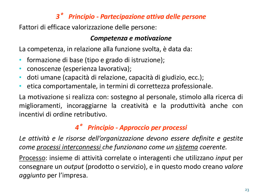 valorizzazione delle persone: Competenza e motivazione La competenza, in relazione alla funzione svolta, è data da: • formazione di base (tipo e grado di istruzione); • conoscenze (esperienza lavorativa); • doti umane (capacità di relazione, capacità di giudizio, ecc.); • etica comportamentale, in termini di correttezza professionale. La motivazione si realizza con: sostegno al personale, stimolo alla ricerca di miglioramenti, incoraggiarne la creatività e la produttività anche con incentivi di ordine retributivo. 4° Principio - Approccio per processi Le attività e le risorse dell’organizzazione devono essere definite e gestite come processi interconnessi che funzionano come un sistema coerente. Processo: insieme di attività correlate o interagenti che utilizzano input per consegnare un output (prodotto o servizio), e in questo modo creano valore aggiunto per l’impresa. 23