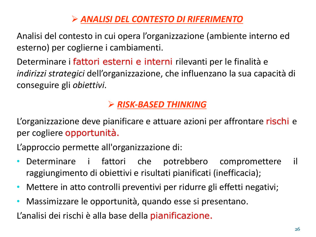 cui opera l’organizzazione (ambiente interno ed esterno) per coglierne i cambiamenti. Determinare i fattori esterni e interni rilevanti per le finalità e indirizzi strategici dell’organizzazione, che influenzano la sua capacità di conseguire gli obiettivi. Ø RISK-BASED THINKING L’organizzazione deve pianificare e attuare azioni per affrontare rischi e per cogliere opportunità. L’approccio permette all'organizzazione di: • Determinare i fattori che potrebbero compromettere il raggiungimento di obiettivi e risultati pianificati (inefficacia); • Mettere in atto controlli preventivi per ridurre gli effetti negativi; • Massimizzare le opportunità, quando esse si presentano. L’analisi dei rischi è alla base della pianificazione. 26 26