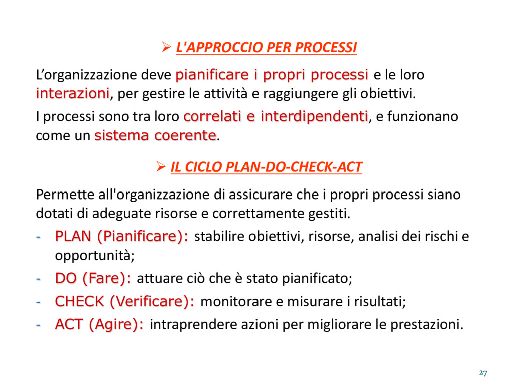 e le loro interazioni, per gestire le attività e raggiungere gli obiettivi. I processi sono tra loro correlati e interdipendenti, e funzionano come un sistema coerente. Ø IL CICLO PLAN-DO-CHECK-ACT Permette all'organizzazione di assicurare che i propri processi siano dotati di adeguate risorse e correttamente gestiti. - PLAN (Pianificare): stabilire obiettivi, risorse, analisi dei rischi e opportunità; - DO (Fare): attuare ciò che è stato pianificato; - CHECK (Verificare): monitorare e misurare i risultati; - ACT (Agire): intraprendere azioni per migliorare le prestazioni. 27 27