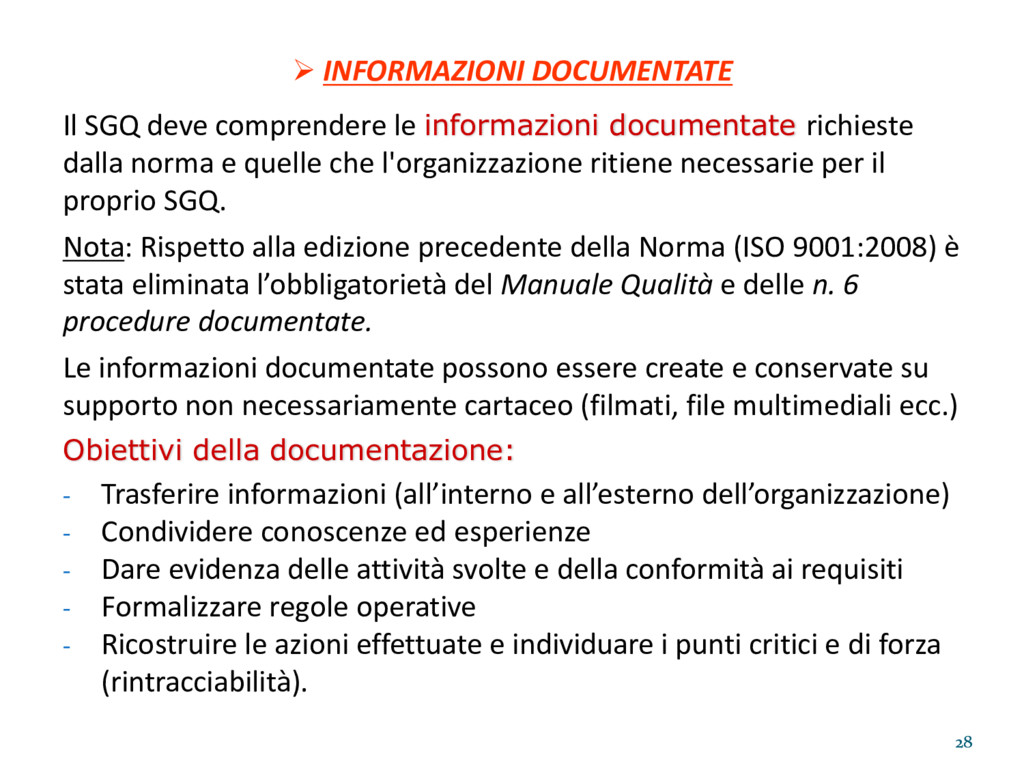 richieste dalla norma e quelle che l'organizzazione ritiene necessarie per il proprio SGQ. Nota: Rispetto alla edizione precedente della Norma (ISO 9001:2008) è stata eliminata l’obbligatorietà del Manuale Qualità e delle n. 6 procedure documentate. Le informazioni documentate possono essere create e conservate su supporto non necessariamente cartaceo (filmati, file multimediali ecc.) Obiettivi della documentazione: - Trasferire informazioni (all’interno e all’esterno dell’organizzazione) - Condividere conoscenze ed esperienze - Dare evidenza delle attività svolte e della conformità ai requisiti - Formalizzare regole operative - Ricostruire le azioni effettuate e individuare i punti critici e di forza (rintracciabilità). 28 28