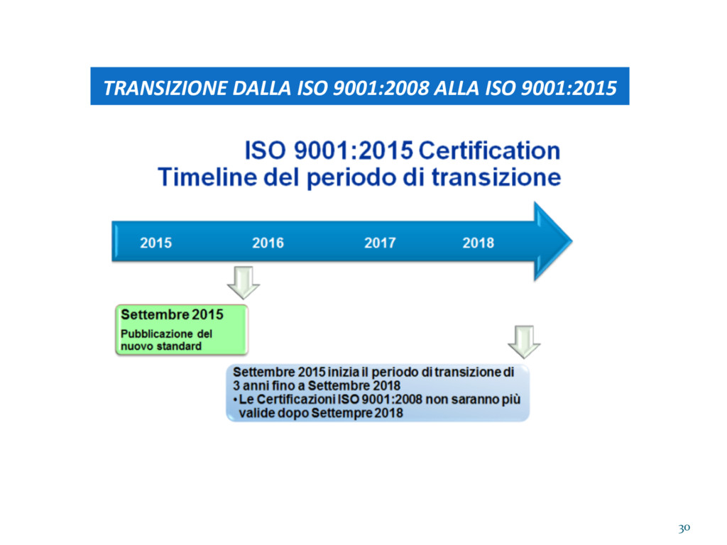 9001 un’organizzazione: Ø Predispone il proprio Sistema di gestione per la Qualità conforme alla norma. Ø Presenta domanda ad un Organismo di Certificazione di parte terza, accreditato per lo schema SGQ da ACCREDIA (Ente unico italiano di accreditamento). Ø L’Organismo di certificazione incaricato: - esamina i documenti presentati dall’azienda; - effettua una visita di valutazione (audit) presso l’azienda per la verifica diretta dell’applicazione del sistema; - al termine emette un rapporto di valutazione, contenente le eventuali non conformità e osservazioni rilevate dal gruppo ispettivo; - il rapporto di valutazione viene esaminato dal Comitato di Certificazione dell’Organismo: se l’esito è positivo, l’Organismo di Certificazione rilascia il Certificato all’Azienda. Ø La certificazione ha durata triennale, alla scadenza può essere rinnovata; Ø l’Organismo di certificazione effettua una verifica annuale di sorveglianza presso l’azienda per il mantenimenti dei requisiti. 29