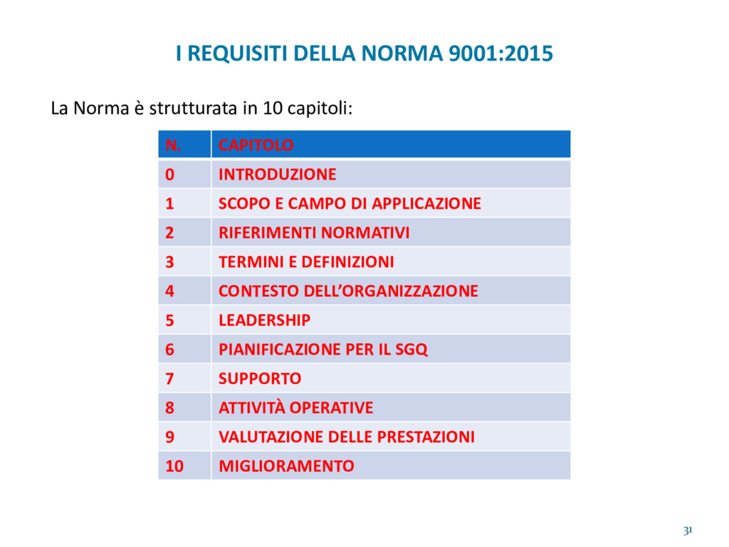 10 capitoli: 31 N. CAPITOLO 0 INTRODUZIONE 1 SCOPO E CAMPO DI APPLICAZIONE 2 RIFERIMENTI NORMATIVI 3 TERMINI E DEFINIZIONI 4 CONTESTO DELL’ORGANIZZAZIONE 5 LEADERSHIP 6 PIANIFICAZIONE PER IL SGQ 7 SUPPORTO 8 ATTIVITÀ OPERATIVE 9 VALUTAZIONE DELLE PRESTAZIONI 10 MIGLIORAMENTO