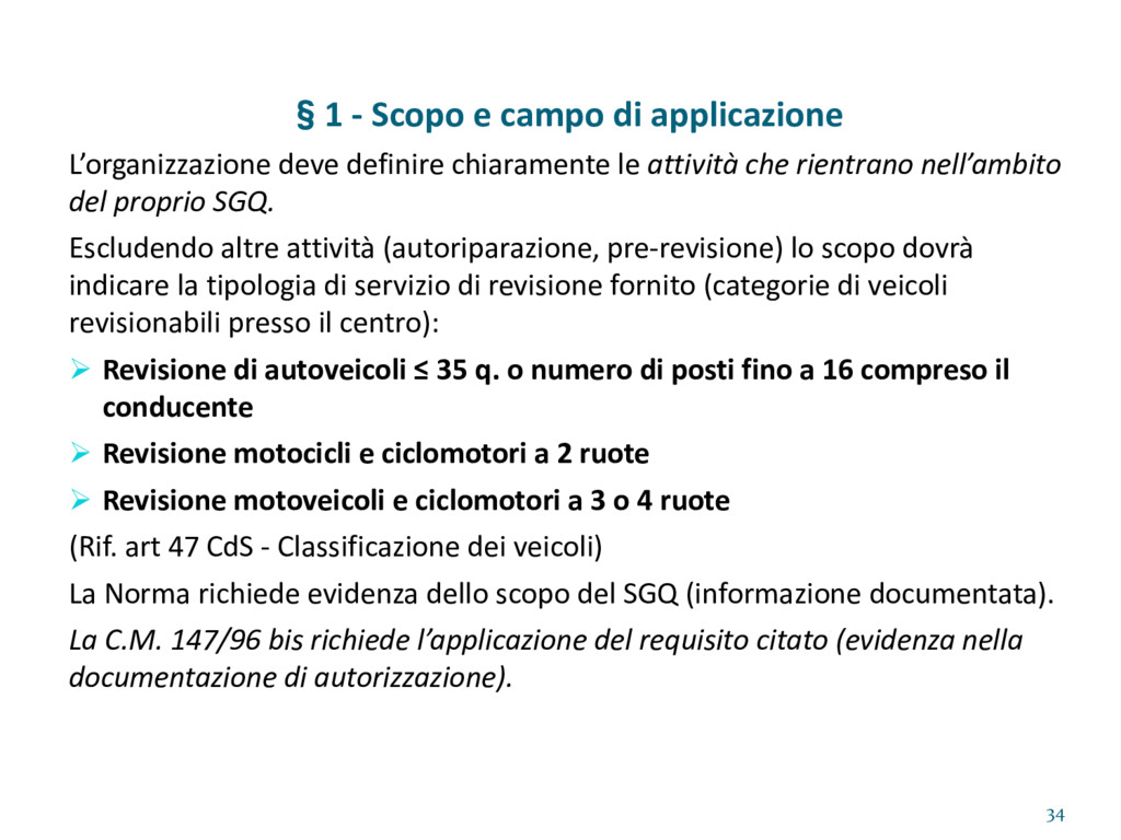 DEL CENTRO DI REVISIONE CONFORME AI REQUISITI DELLA NORMA ISO 9001:2015 E DELLA C.M. 147/96 BIS Presupposti: Ø I requisiti della Norma ISO 9001:2015 vengono messi in correlazione con i requisiti (amministrativi, tecnici, di qualità del servizio) previsti dalla C.M. 147/96 bis. Note: Ø La C.M. 147/96 bis fa riferimento alla Norma ISO 9001:2000 (oggi superata) → non perfetto allineamento alla ISO 9001:2015 Ø Per ciascun requisito della Norma viene riportata la relativa applicabilità (totale, parziale o la non applicabilità) ai sensi della C.M. 147/96 bis, e le relative evidenze di conformità. Ø Ove il requisito della Norma integri una prescrizione cogente (legge, decreto o circolare ministeriale), la piena rispondenza deve essere comunque garantita, sia ai fini dei requisiti richiesti dall’Amministrazione, sia ai fini della conformità del SGQ alla Norma stessa. 33