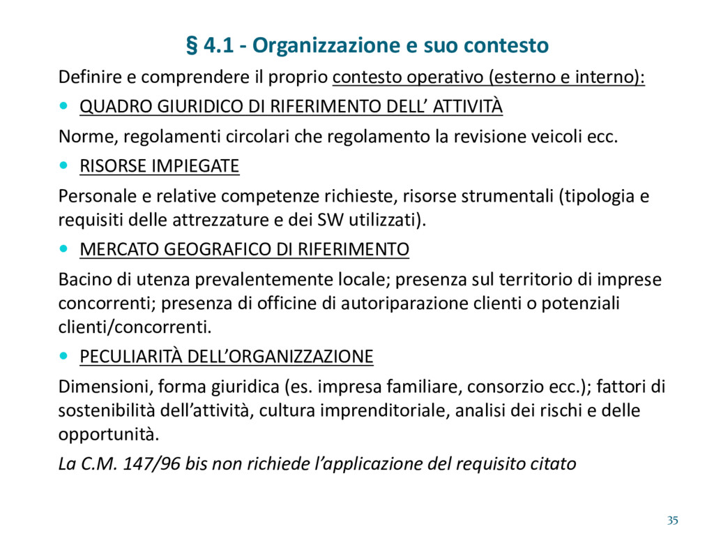 proprio contesto operativo (esterno e interno): QUADRO GIURIDICO DI RIFERIMENTO DELL’ ATTIVITÀ Norme, regolamenti circolari che regolamento la revisione veicoli ecc. RISORSE IMPIEGATE Personale e relative competenze richieste, risorse strumentali (tipologia e requisiti delle attrezzature e dei SW utilizzati). MERCATO GEOGRAFICO DI RIFERIMENTO Bacino di utenza prevalentemente locale; presenza sul territorio di imprese concorrenti; presenza di officine di autoriparazione clienti o potenziali clienti/concorrenti. PECULIARITÀ DELL’ORGANIZZAZIONE Dimensioni, forma giuridica (es. impresa familiare, consorzio ecc.); fattori di sostenibilità dell’attività, cultura imprenditoriale, analisi dei rischi e delle opportunità. La C.M. 147/96 bis non richiede l’applicazione del requisito citato 35