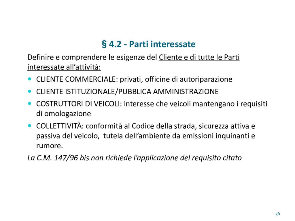 Cliente e di tutte le Parti interessate all’attività: CLIENTE COMMERCIALE: privati, officine di autoriparazione CLIENTE ISTITUZIONALE/PUBBLICA AMMINISTRAZIONE COSTRUTTORI DI VEICOLI: interesse che veicoli mantengano i requisiti di omologazione COLLETTIVITÀ: conformità al Codice della strada, sicurezza attiva e passiva del veicolo, tutela dell’ambiente da emissioni inquinanti e rumore. La C.M. 147/96 bis non richiede l’applicazione del requisito citato 36