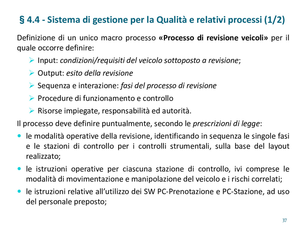 processi (1/2) Definizione di un unico macro processo «Processo di revisione veicoli» per il quale occorre definire: Ø Input: condizioni/requisiti del veicolo sottoposto a revisione; Ø Output: esito della revisione Ø Sequenza e interazione: fasi del processo di revisione Ø Procedure di funzionamento e controllo Ø Risorse impiegate, responsabilità ed autorità. Il processo deve definire puntualmente, secondo le prescrizioni di legge: le modalità operative della revisione, identificando in sequenza le singole fasi e le stazioni di controllo per i controlli strumentali, sulla base del layout realizzato; le istruzioni operative per ciascuna stazione di controllo, ivi comprese le modalità di movimentazione e manipolazione del veicolo e i rischi correlati; le istruzioni relative all’utilizzo dei SW PC-Prenotazione e PC-Stazione, ad uso del personale preposto; 37
