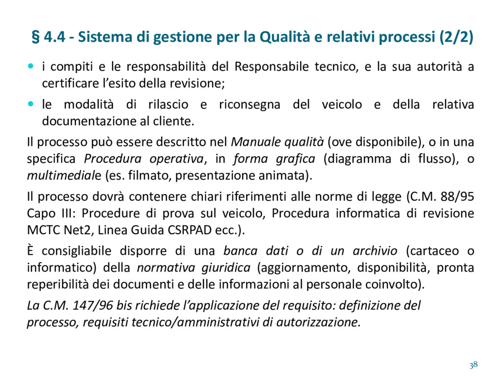 processi (2/2) i compiti e le responsabilità del Responsabile tecnico, e la sua autorità a certificare l’esito della revisione; le modalità di rilascio e riconsegna del veicolo e della relativa documentazione al cliente. Il processo può essere descritto nel Manuale qualità (ove disponibile), o in una specifica Procedura operativa, in forma grafica (diagramma di flusso), o multimediale (es. filmato, presentazione animata). Il processo dovrà contenere chiari riferimenti alle norme di legge (C.M. 88/95 Capo III: Procedure di prova sul veicolo, Procedura informatica di revisione MCTC Net2, Linea Guida CSRPAD ecc.). È consigliabile disporre di una banca dati o di un archivio (cartaceo o informatico) della normativa giuridica (aggiornamento, disponibilità, pronta reperibilità dei documenti e delle informazioni al personale coinvolto). La C.M. 147/96 bis richiede l’applicazione del requisito: definizione del processo, requisiti tecnico/amministrativi di autorizzazione. 38