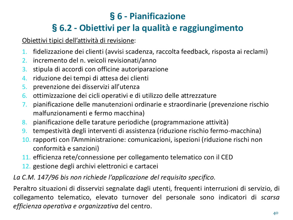 raggiungimento Obiettivi tipici dell’attività di revisione: 1. fidelizzazione dei clienti (avvisi scadenza, raccolta feedback, risposta ai reclami) 2. incremento del n. veicoli revisionati/anno 3. stipula di accordi con officine autoriparazione 4. riduzione dei tempi di attesa dei clienti 5. prevenzione dei disservizi all’utenza 6. ottimizzazione dei cicli operativi e di utilizzo delle attrezzature 7. pianificazione delle manutenzioni ordinarie e straordinarie (prevenzione rischio malfunzionamenti e fermo macchina) 8. pianificazione delle tarature periodiche (programmazione attività) 9. tempestività degli interventi di assistenza (riduzione rischio fermo-macchina) 10. rapporti con l’Amministrazione: comunicazioni, ispezioni (riduzione rischi non conformità e sanzioni) 11. efficienza rete/connessione per collegamento telematico con il CED 12. gestione degli archivi elettronici e cartacei La C.M. 147/96 bis non richiede l’applicazione del requisito specifico. Peraltro situazioni di disservizi segnalate dagli utenti, frequenti interruzioni di servizio, di collegamento telematico, elevato turnover del personale sono indicatori di scarsa efficienza operativa e organizzativa del centro. 40