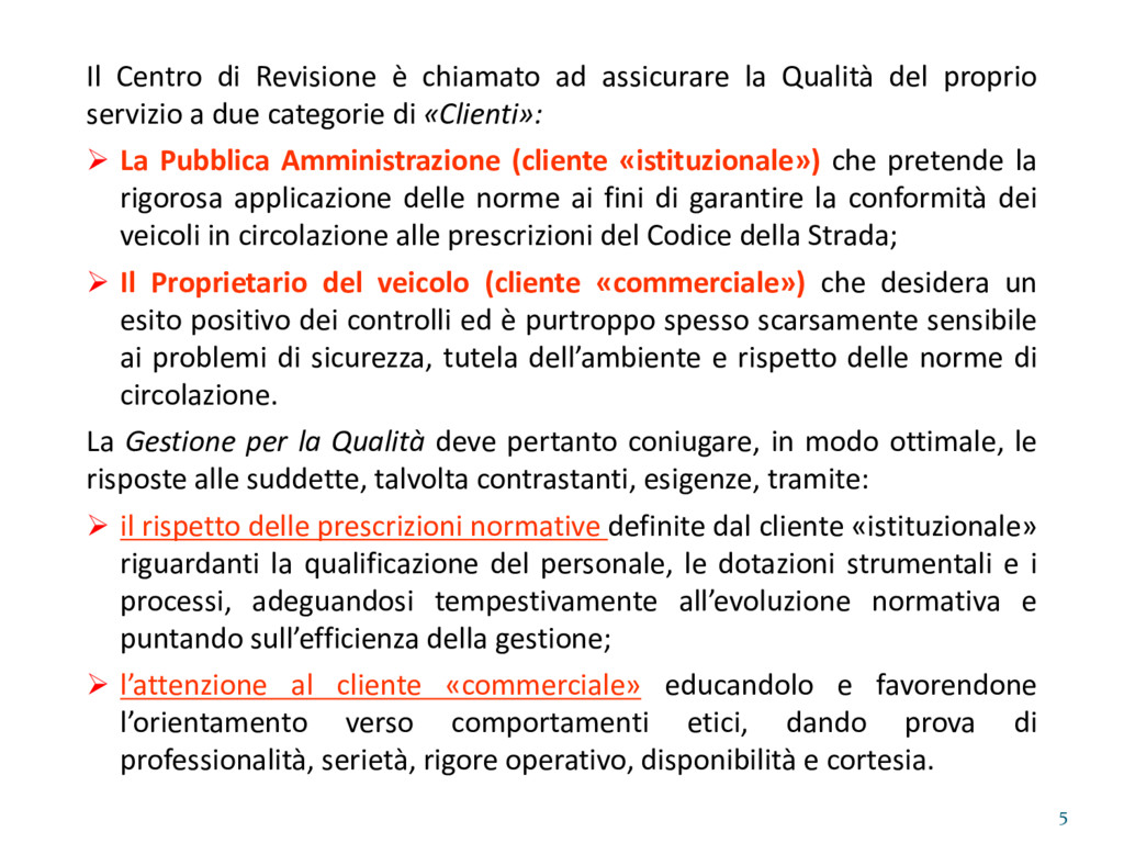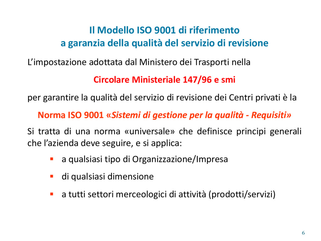 del proprio servizio a due categorie di «Clienti»: Ø La Pubblica Amministrazione (cliente «istituzionale») che pretende la rigorosa applicazione delle norme ai fini di garantire la conformità dei veicoli in circolazione alle prescrizioni del Codice della Strada; Ø Il Proprietario del veicolo (cliente «commerciale») che desidera un esito positivo dei controlli ed è purtroppo spesso scarsamente sensibile ai problemi di sicurezza, tutela dell’ambiente e rispetto delle norme di circolazione. La Gestione per la Qualità deve pertanto coniugare, in modo ottimale, le risposte alle suddette, talvolta contrastanti, esigenze, tramite: Ø il rispetto delle prescrizioni normative definite dal cliente «istituzionale» riguardanti la qualificazione del personale, le dotazioni strumentali e i processi, adeguandosi tempestivamente all’evoluzione normativa e puntando sull’efficienza della gestione; Ø l’attenzione al cliente «commerciale» educandolo e favorendone l’orientamento verso comportamenti etici, dando prova di professionalità, serietà, rigore operativo, disponibilità e cortesia. 5