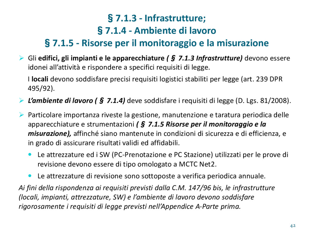 Infrastrutture) devono essere idonei all’attività e rispondere a specifici requisiti di legge. I locali devono soddisfare precisi requisiti logistici stabiliti per legge (art. 239 DPR 495/92). Ø L’ambiente di lavoro (§ 7.1.4) deve soddisfare i requisiti di legge (D. Lgs. 81/2008). Ø Particolare importanza riveste la gestione, manutenzione e taratura periodica delle apparecchiature e strumentazioni (§ 7.1.5 Risorse per il monitoraggio e la misurazione), affinché siano mantenute in condizioni di sicurezza e di efficienza, e in grado di assicurare risultati validi ed affidabili. Le attrezzature ed i SW (PC-Prenotazione e PC Stazione) utilizzati per le prove di revisione devono essere di tipo omologato a MCTC Net2. Le attrezzature di revisione sono sottoposte a verifica periodica annuale. Ai fini della rispondenza ai requisiti previsti dalla C.M. 147/96 bis, le infrastrutture (locali, impianti, attrezzature, SW) e l’ambiente di lavoro devono soddisfare rigorosamente i requisiti di legge previsti nell’Appendice A-Parte prima. 42 §7.1.3 - Infrastrutture; §7.1.4 - Ambiente di lavoro §7.1.5 - Risorse per il monitoraggio e la misurazione