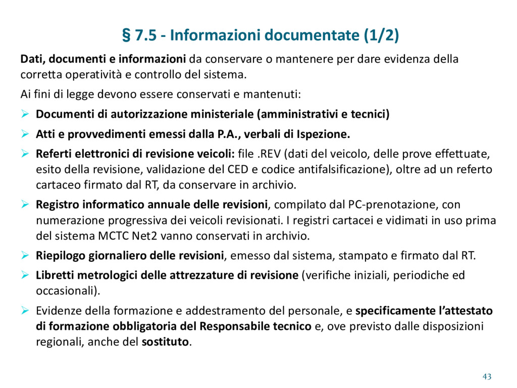 evidenza della corretta operatività e controllo del sistema. Ai fini di legge devono essere conservati e mantenuti: Ø Documenti di autorizzazione ministeriale (amministrativi e tecnici) Ø Atti e provvedimenti emessi dalla P.A., verbali di Ispezione. Ø Referti elettronici di revisione veicoli: file .REV (dati del veicolo, delle prove effettuate, esito della revisione, validazione del CED e codice antifalsificazione), oltre ad un referto cartaceo firmato dal RT, da conservare in archivio. Ø Registro informatico annuale delle revisioni, compilato dal PC-prenotazione, con numerazione progressiva dei veicoli revisionati. I registri cartacei e vidimati in uso prima del sistema MCTC Net2 vanno conservati in archivio. Ø Riepilogo giornaliero delle revisioni, emesso dal sistema, stampato e firmato dal RT. Ø Libretti metrologici delle attrezzature di revisione (verifiche iniziali, periodiche ed occasionali). Ø Evidenze della formazione e addestramento del personale, e specificamente l’attestato di formazione obbligatoria del Responsabile tecnico e, ove previsto dalle disposizioni regionali, anche del sostituto. 43 §7.5 - Informazioni documentate (1/2)