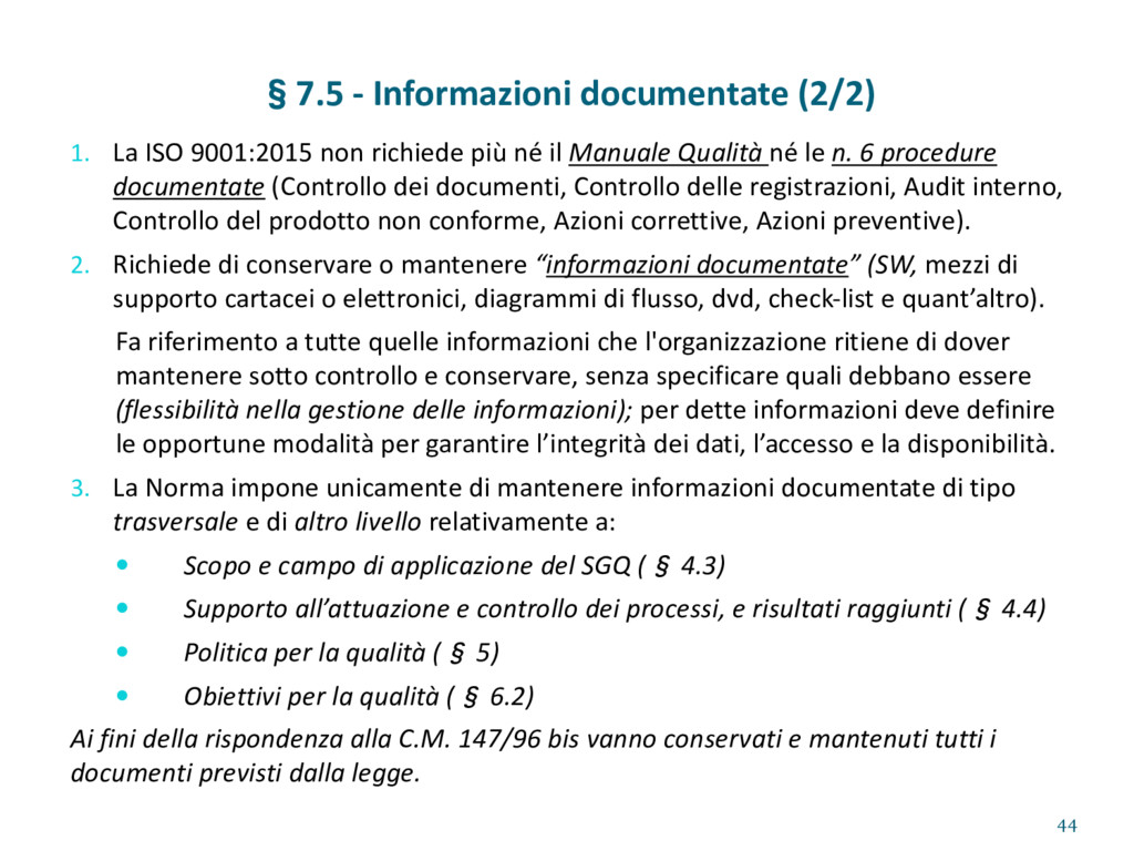 Qualità né le n. 6 procedure documentate (Controllo dei documenti, Controllo delle registrazioni, Audit interno, Controllo del prodotto non conforme, Azioni correttive, Azioni preventive). 2. Richiede di conservare o mantenere “informazioni documentate” (SW, mezzi di supporto cartacei o elettronici, diagrammi di flusso, dvd, check-list e quant’altro). Fa riferimento a tutte quelle informazioni che l'organizzazione ritiene di dover mantenere sotto controllo e conservare, senza specificare quali debbano essere (flessibilità nella gestione delle informazioni); per dette informazioni deve definire le opportune modalità per garantire l’integrità dei dati, l’accesso e la disponibilità. 3. La Norma impone unicamente di mantenere informazioni documentate di tipo trasversale e di altro livello relativamente a: Scopo e campo di applicazione del SGQ (§ 4.3) Supporto all’attuazione e controllo dei processi, e risultati raggiunti (§ 4.4) Politica per la qualità (§ 5) Obiettivi per la qualità (§ 6.2) Ai fini della rispondenza alla C.M. 147/96 bis vanno conservati e mantenuti tutti i documenti previsti dalla legge. 44 §7.5 - Informazioni documentate (2/2)