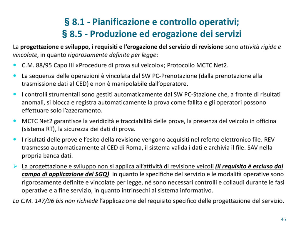 di revisione sono attività rigide e vincolate, in quanto rigorosamente definite per legge: C.M. 88/95 Capo III «Procedure di prova sul veicolo»; Protocollo MCTC Net2. La sequenza delle operazioni è vincolata dal SW PC-Prenotazione (dalla prenotazione alla trasmissione dati al CED) e non è manipolabile dall’operatore. I controlli strumentali sono gestiti automaticamente dal SW PC-Stazione che, a fronte di risultati anomali, si blocca e registra automaticamente la prova come fallita e gli operatori possono effettuare solo l’azzeramento. MCTC Net2 garantisce la veridicità e tracciabilità delle prove, la presenza del veicolo in officina (sistema RT), la sicurezza dei dati di prova. I risultati delle prove e l’esito della revisione vengono acquisiti nel referto elettronico file. REV trasmesso automaticamente al CED di Roma, il sistema valida i dati e archivia il file. SAV nella propria banca dati. Ø La progettazione e sviluppo non si applica all’attività di revisione veicoli (il requisito è escluso dal campo di applicazione del SGQ) in quanto le specifiche del servizio e le modalità operative sono rigorosamente definite e vincolate per legge, né sono necessari controlli e collaudi durante le fasi operative e a fine servizio, in quanto intrinsechi al sistema informativo. La C.M. 147/96 bis non richiede l’applicazione del requisito specifico delle progettazione del servizio. 45 §8.1 - Pianificazione e controllo operativi; §8.5 - Produzione ed erogazione dei servizi
