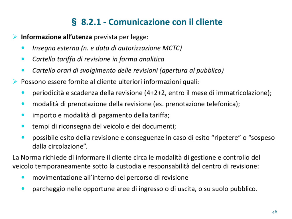 e data di autorizzazione MCTC) Cartello tariffa di revisione in forma analitica Cartello orari di svolgimento delle revisioni (apertura al pubblico) Ø Possono essere fornite al cliente ulteriori informazioni quali: periodicità e scadenza della revisione (4+2+2, entro il mese di immatricolazione); modalità di prenotazione della revisione (es. prenotazione telefonica); importo e modalità di pagamento della tariffa; tempi di riconsegna del veicolo e dei documenti; possibile esito della revisione e conseguenze in caso di esito “ripetere” o “sospeso dalla circolazione”. La Norma richiede di informare il cliente circa le modalità di gestione e controllo del veicolo temporaneamente sotto la custodia e responsabilità del centro di revisione: movimentazione all’interno del percorso di revisione parcheggio nelle opportune aree di ingresso o di uscita, o su suolo pubblico. 46 § 8.2.1 - Comunicazione con il cliente