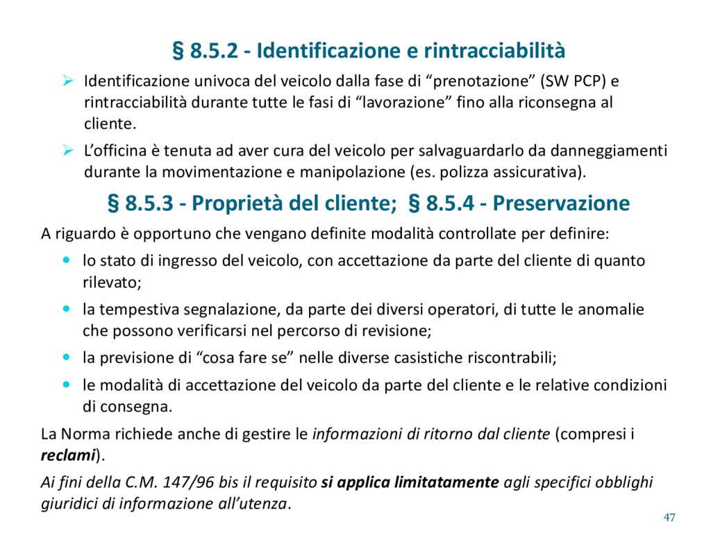 dalla fase di “prenotazione” (SW PCP) e rintracciabilità durante tutte le fasi di “lavorazione” fino alla riconsegna al cliente. Ø L’officina è tenuta ad aver cura del veicolo per salvaguardarlo da danneggiamenti durante la movimentazione e manipolazione (es. polizza assicurativa). §8.5.3 - Proprietà del cliente; §8.5.4 - Preservazione A riguardo è opportuno che vengano definite modalità controllate per definire: lo stato di ingresso del veicolo, con accettazione da parte del cliente di quanto rilevato; la tempestiva segnalazione, da parte dei diversi operatori, di tutte le anomalie che possono verificarsi nel percorso di revisione; la previsione di “cosa fare se” nelle diverse casistiche riscontrabili; le modalità di accettazione del veicolo da parte del cliente e le relative condizioni di consegna. La Norma richiede anche di gestire le informazioni di ritorno dal cliente (compresi i reclami). Ai fini della C.M. 147/96 bis il requisito si applica limitatamente agli specifici obblighi giuridici di informazione all’utenza. 47