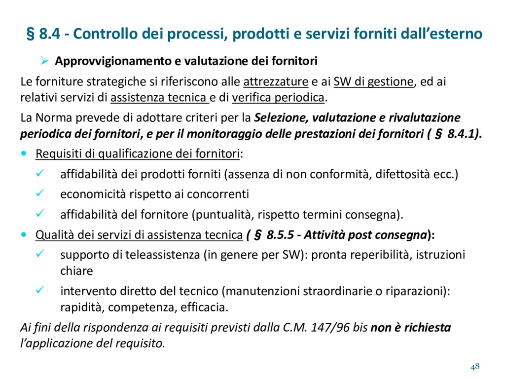 riferiscono alle attrezzature e ai SW di gestione, ed ai relativi servizi di assistenza tecnica e di verifica periodica. La Norma prevede di adottare criteri per la Selezione, valutazione e rivalutazione periodica dei fornitori, e per il monitoraggio delle prestazioni dei fornitori (§ 8.4.1). Requisiti di qualificazione dei fornitori: ü affidabilità dei prodotti forniti (assenza di non conformità, difettosità ecc.) ü economicità rispetto ai concorrenti ü affidabilità del fornitore (puntualità, rispetto termini consegna). Qualità dei servizi di assistenza tecnica (§ 8.5.5 - Attività post consegna): ü supporto di teleassistenza (in genere per SW): pronta reperibilità, istruzioni chiare ü intervento diretto del tecnico (manutenzioni straordinarie o riparazioni): rapidità, competenza, efficacia. Ai fini della rispondenza ai requisiti previsti dalla C.M. 147/96 bis non è richiesta l’applicazione del requisito. 48 §8.4 - Controllo dei processi, prodotti e servizi forniti dall’esterno