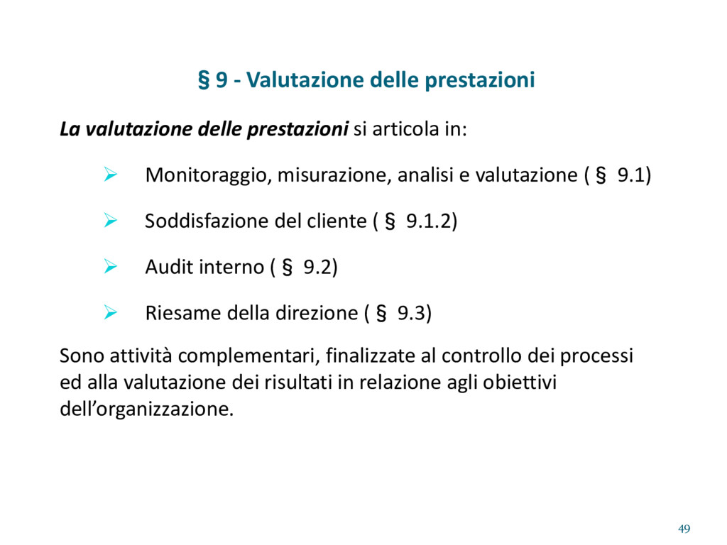 analisi e valutazione (§ 9.1) Ø Soddisfazione del cliente (§ 9.1.2) Ø Audit interno (§ 9.2) Ø Riesame della direzione (§ 9.3) Sono attività complementari, finalizzate al controllo dei processi ed alla valutazione dei risultati in relazione agli obiettivi dell’organizzazione. 49 §9 - Valutazione delle prestazioni