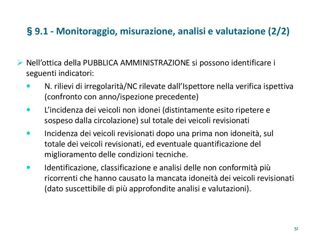 i risultati conseguiti, ed i relativi scostamenti rispetto agli obiettivi. Indicatori e obiettivi (vedi slide n. 40): N. veicoli revisionati/anno (anno precedente, scostamento rispetto al valore- obiettivo) N. clienti fidelizzati (scostamento rispetto al valore-obiettivo) N. accordi stipulati con officine autoriparazione e relativo n. veicoli revisionati (scostamento rispetto al valore-obiettivo) Tempi medi di attesa dei clienti (valore medio anno precedente e scostamento rispetto al valore-obiettivo) N. casi di disservizio all’utenza (anno precedente, scostamento rispetto al valore-obiettivo) N. reclami dell’utenza (come sopra) N. fermate linea di revisione per guasti alle attrezzature, ritardi nelle riparazioni (anno precedente, scostamento rispetto al valore-obiettivo) N. casi di mancanza collegamento telematico con il CED (anno precedente, scostamento rispetto al valore-obiettivo) Ecc… 50 §9.1 - Monitoraggio, misurazione, analisi e valutazione (1/2)