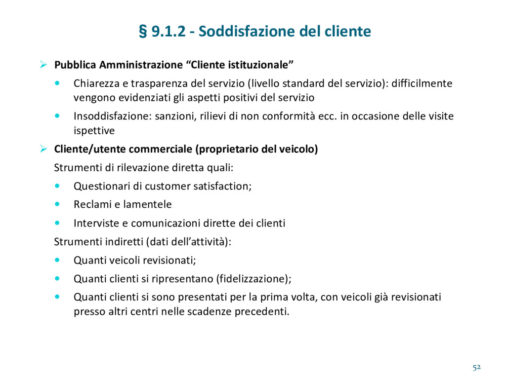 servizio (livello standard del servizio): difficilmente vengono evidenziati gli aspetti positivi del servizio Insoddisfazione: sanzioni, rilievi di non conformità ecc. in occasione delle visite ispettive Ø Cliente/utente commerciale (proprietario del veicolo) Strumenti di rilevazione diretta quali: Questionari di customer satisfaction; Reclami e lamentele Interviste e comunicazioni dirette dei clienti Strumenti indiretti (dati dell’attività): Quanti veicoli revisionati; Quanti clienti si ripresentano (fidelizzazione); Quanti clienti si sono presentati per la prima volta, con veicoli già revisionati presso altri centri nelle scadenze precedenti. 52 §9.1.2 - Soddisfazione del cliente