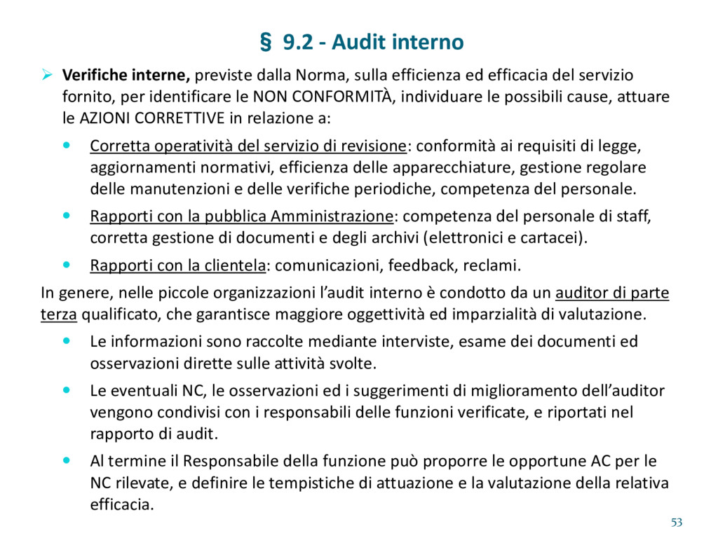 del servizio fornito, per identificare le NON CONFORMITÀ, individuare le possibili cause, attuare le AZIONI CORRETTIVE in relazione a: Corretta operatività del servizio di revisione: conformità ai requisiti di legge, aggiornamenti normativi, efficienza delle apparecchiature, gestione regolare delle manutenzioni e delle verifiche periodiche, competenza del personale. Rapporti con la pubblica Amministrazione: competenza del personale di staff, corretta gestione di documenti e degli archivi (elettronici e cartacei). Rapporti con la clientela: comunicazioni, feedback, reclami. In genere, nelle piccole organizzazioni l’audit interno è condotto da un auditor di parte terza qualificato, che garantisce maggiore oggettività ed imparzialità di valutazione. Le informazioni sono raccolte mediante interviste, esame dei documenti ed osservazioni dirette sulle attività svolte. Le eventuali NC, le osservazioni ed i suggerimenti di miglioramento dell’auditor vengono condivisi con i responsabili delle funzioni verificate, e riportati nel rapporto di audit. Al termine il Responsabile della funzione può proporre le opportune AC per le NC rilevate, e definire le tempistiche di attuazione e la valutazione della relativa efficacia. 53 § 9.2 - Audit interno