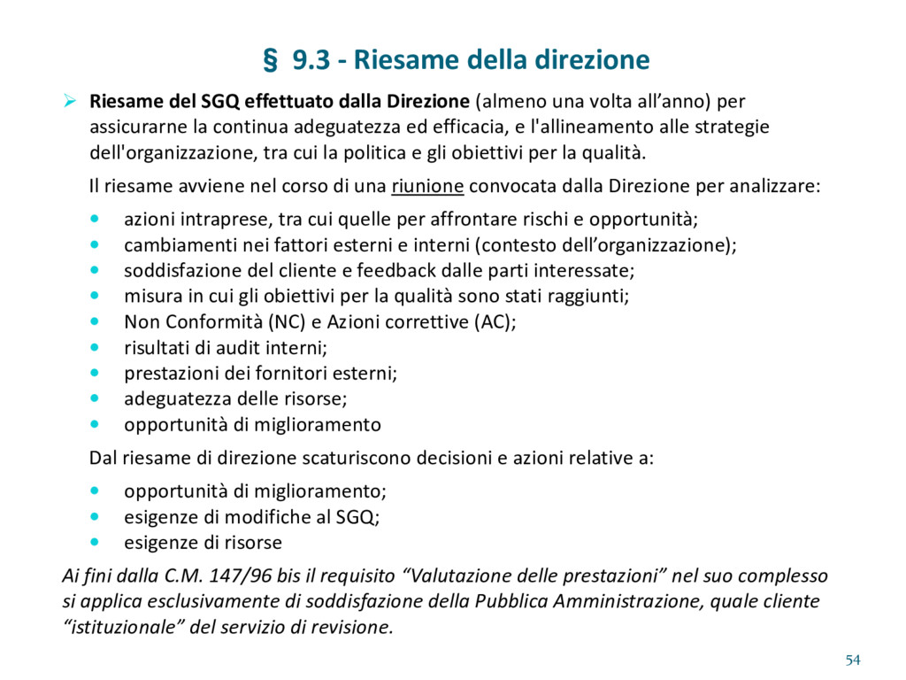 all’anno) per assicurarne la continua adeguatezza ed efficacia, e l'allineamento alle strategie dell'organizzazione, tra cui la politica e gli obiettivi per la qualità. Il riesame avviene nel corso di una riunione convocata dalla Direzione per analizzare: azioni intraprese, tra cui quelle per affrontare rischi e opportunità; cambiamenti nei fattori esterni e interni (contesto dell’organizzazione); soddisfazione del cliente e feedback dalle parti interessate; misura in cui gli obiettivi per la qualità sono stati raggiunti; Non Conformità (NC) e Azioni correttive (AC); risultati di audit interni; prestazioni dei fornitori esterni; adeguatezza delle risorse; opportunità di miglioramento Dal riesame di direzione scaturiscono decisioni e azioni relative a: opportunità di miglioramento; esigenze di modifiche al SGQ; esigenze di risorse Ai fini dalla C.M. 147/96 bis il requisito “Valutazione delle prestazioni” nel suo complesso si applica esclusivamente di soddisfazione della Pubblica Amministrazione, quale cliente “istituzionale” del servizio di revisione. 54 § 9.3 - Riesame della direzione
