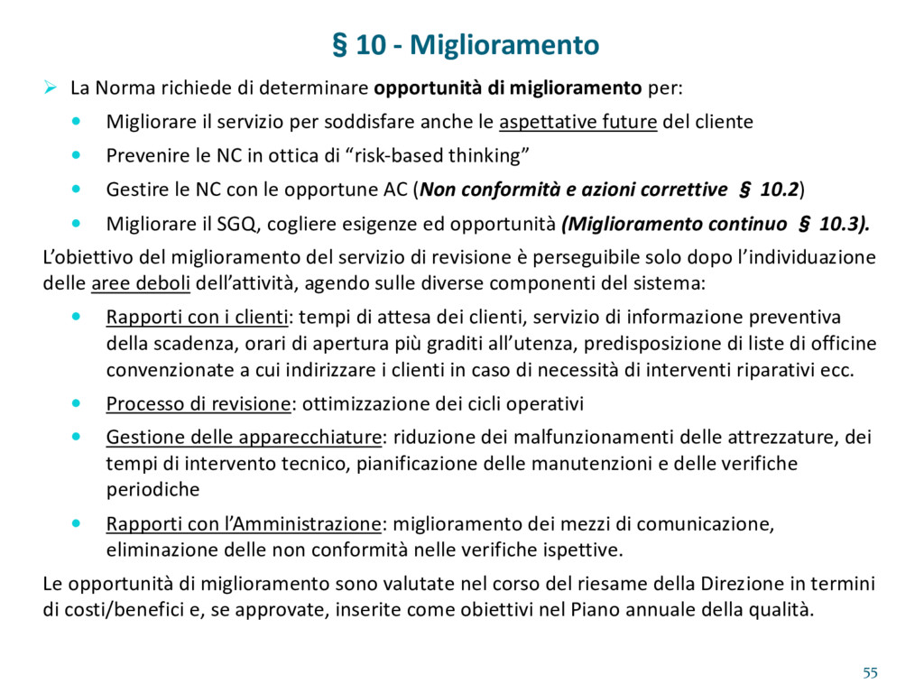 Migliorare il servizio per soddisfare anche le aspettative future del cliente Prevenire le NC in ottica di “risk-based thinking” Gestire le NC con le opportune AC (Non conformità e azioni correttive § 10.2) Migliorare il SGQ, cogliere esigenze ed opportunità (Miglioramento continuo § 10.3). L’obiettivo del miglioramento del servizio di revisione è perseguibile solo dopo l’individuazione delle aree deboli dell’attività, agendo sulle diverse componenti del sistema: Rapporti con i clienti: tempi di attesa dei clienti, servizio di informazione preventiva della scadenza, orari di apertura più graditi all’utenza, predisposizione di liste di officine convenzionate a cui indirizzare i clienti in caso di necessità di interventi riparativi ecc. Processo di revisione: ottimizzazione dei cicli operativi Gestione delle apparecchiature: riduzione dei malfunzionamenti delle attrezzature, dei tempi di intervento tecnico, pianificazione delle manutenzioni e delle verifiche periodiche Rapporti con l’Amministrazione: miglioramento dei mezzi di comunicazione, eliminazione delle non conformità nelle verifiche ispettive. Le opportunità di miglioramento sono valutate nel corso del riesame della Direzione in termini di costi/benefici e, se approvate, inserite come obiettivi nel Piano annuale della qualità. 55 §10 - Miglioramento
