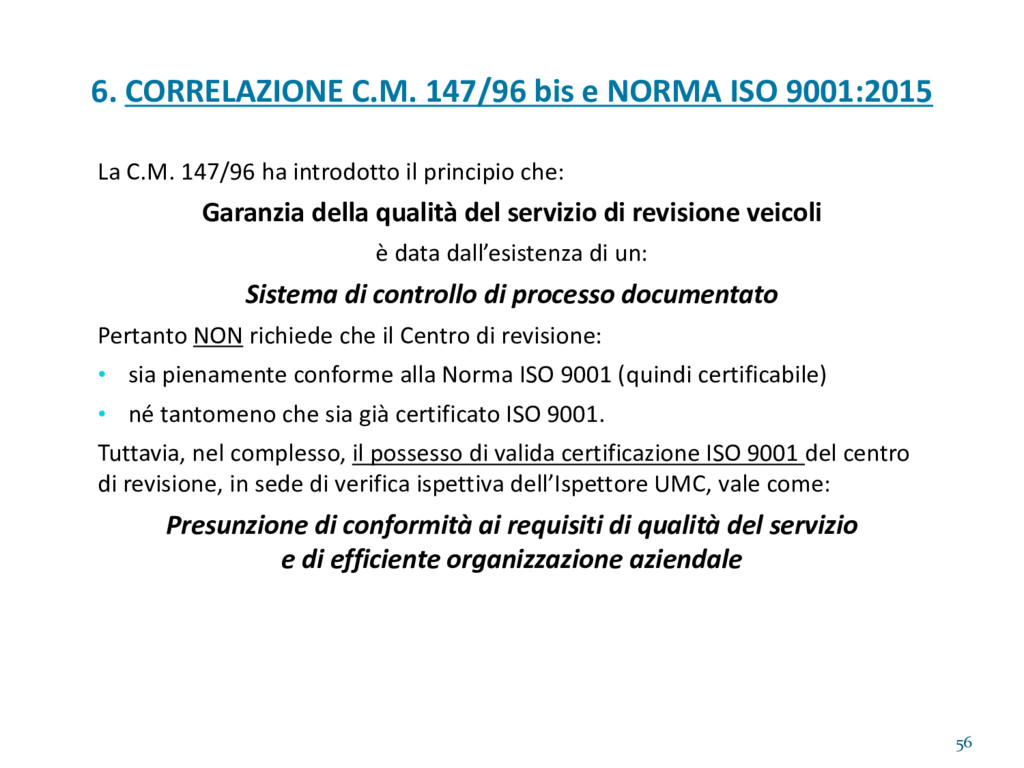 qualità del servizio di revisione veicoli è data dall’esistenza di un: Sistema di controllo di processo documentato Pertanto NON richiede che il Centro di revisione: • sia pienamente conforme alla Norma ISO 9001 (quindi certificabile) • né tantomeno che sia già certificato ISO 9001. Tuttavia, nel complesso, il possesso di valida certificazione ISO 9001 del centro di revisione, in sede di verifica ispettiva dell’Ispettore UMC, vale come: Presunzione di conformità ai requisiti di qualità del servizio e di efficiente organizzazione aziendale 56 6. CORRELAZIONE C.M. 147/96 bis e NORMA ISO 9001:2015
