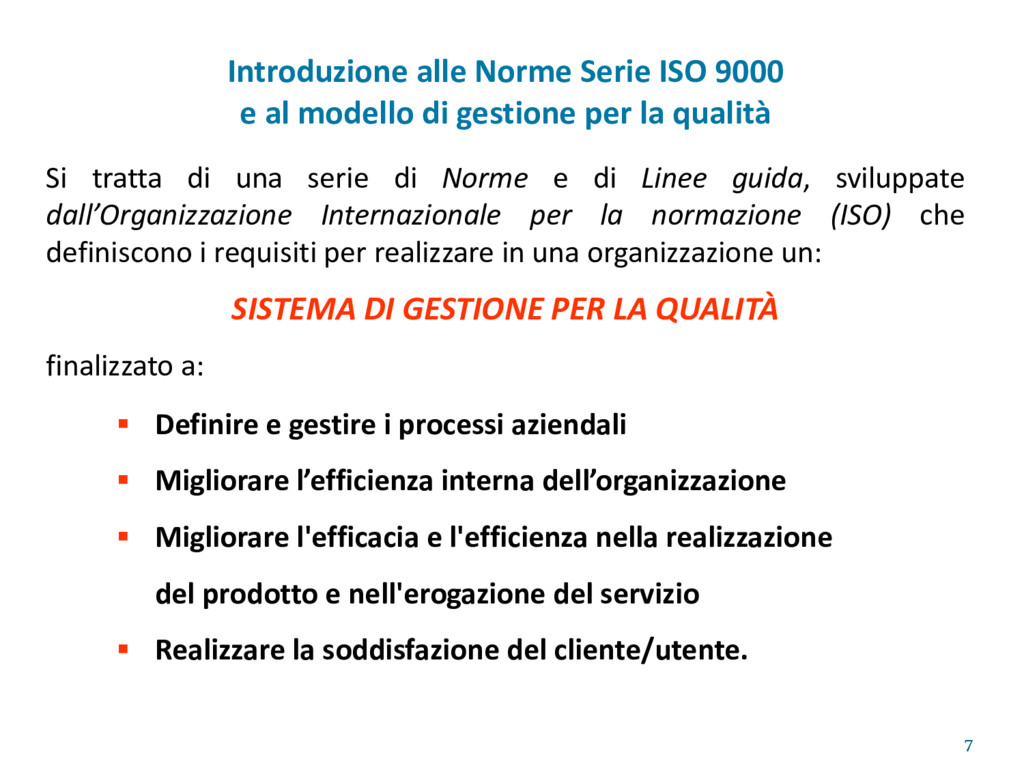 del servizio di revisione L’impostazione adottata dal Ministero dei Trasporti nella Circolare Ministeriale 147/96 e smi per garantire la qualità del servizio di revisione dei Centri privati è la Norma ISO 9001 «Sistemi di gestione per la qualità - Requisiti» Si tratta di una norma «universale» che definisce principi generali che l’azienda deve seguire, e si applica: § a qualsiasi tipo di Organizzazione/Impresa § di qualsiasi dimensione § a tutti settori merceologici di attività (prodotti/servizi) 6