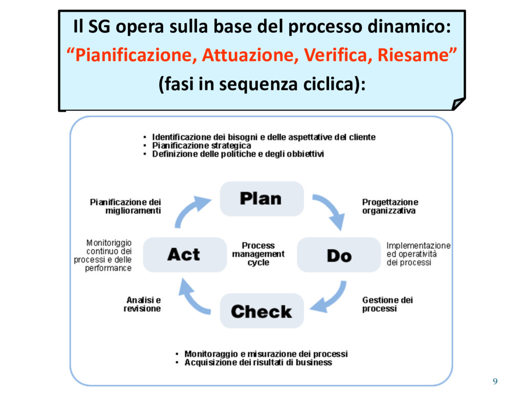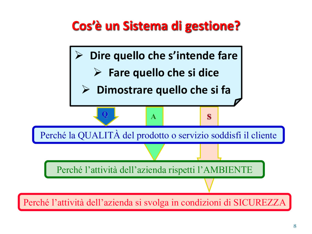 quello che si dice Ø Dimostrare quello che si fa Cos’è un Sistema di gestione? Perché la QUALITÀ del prodotto o servizio soddisfi il cliente Perché l’attività dell’azienda rispetti l’AMBIENTE Perché l’attività dell’azienda si svolga in condizioni di SICUREZZA Q 8