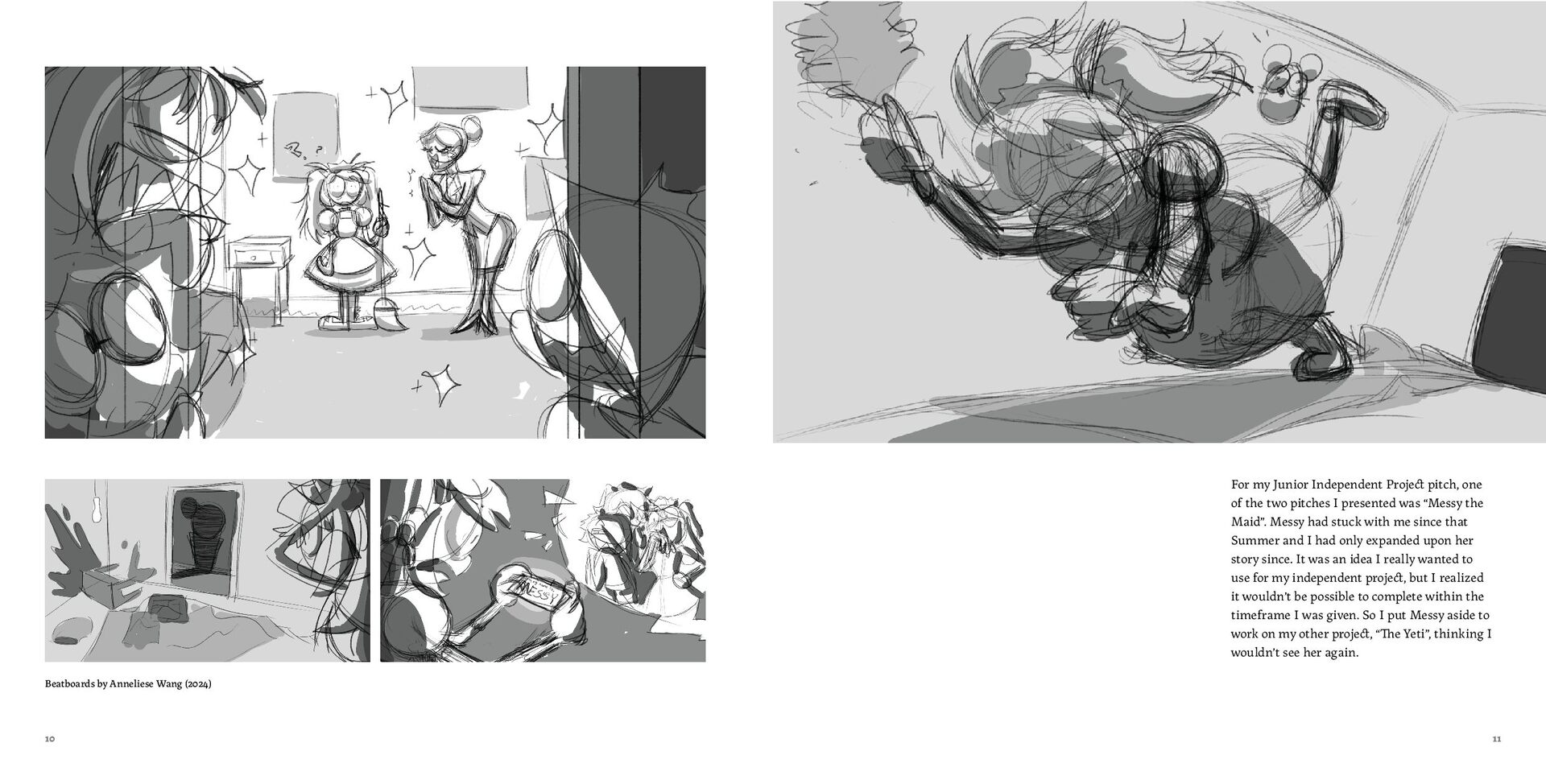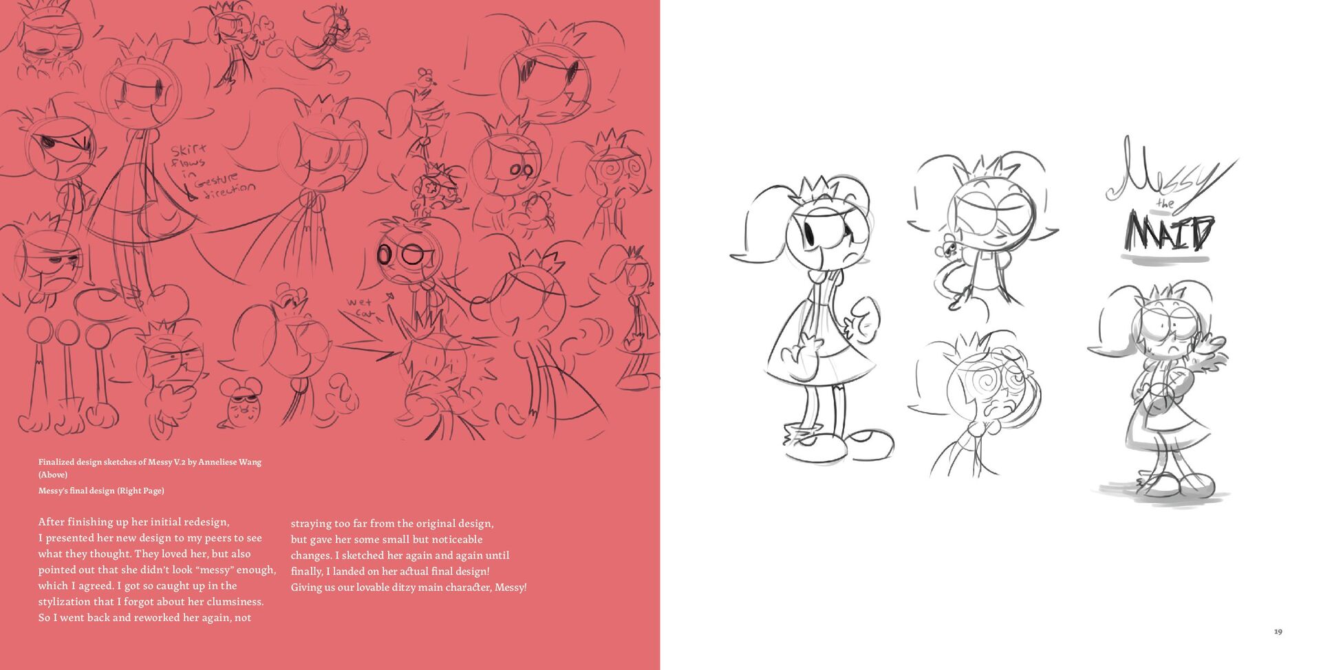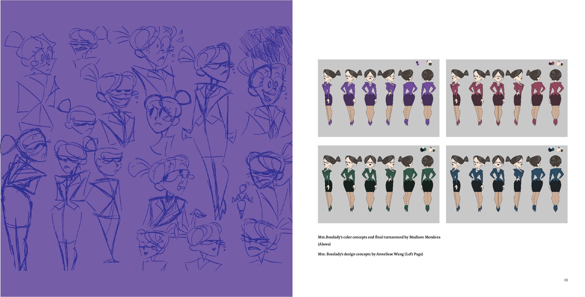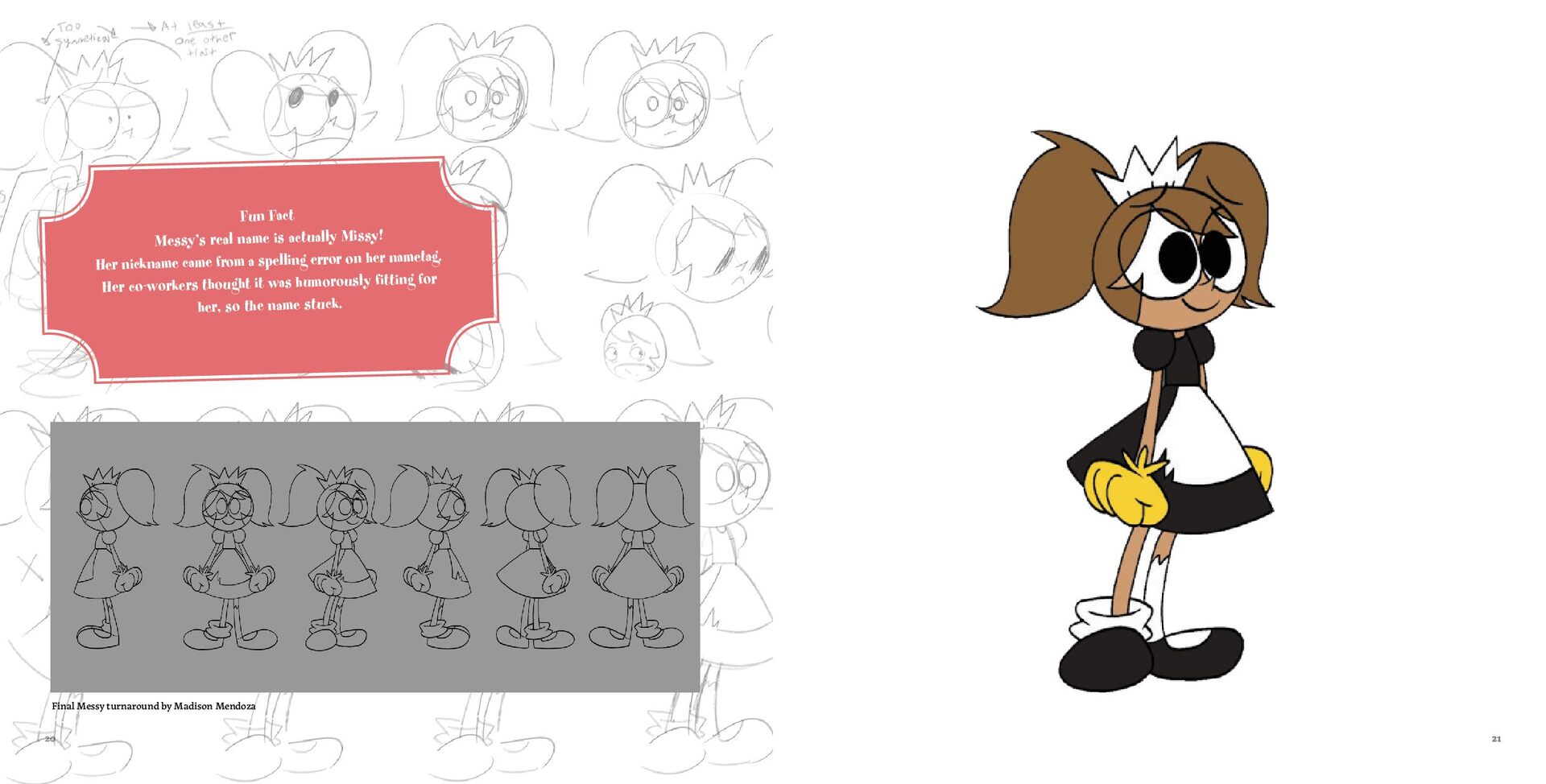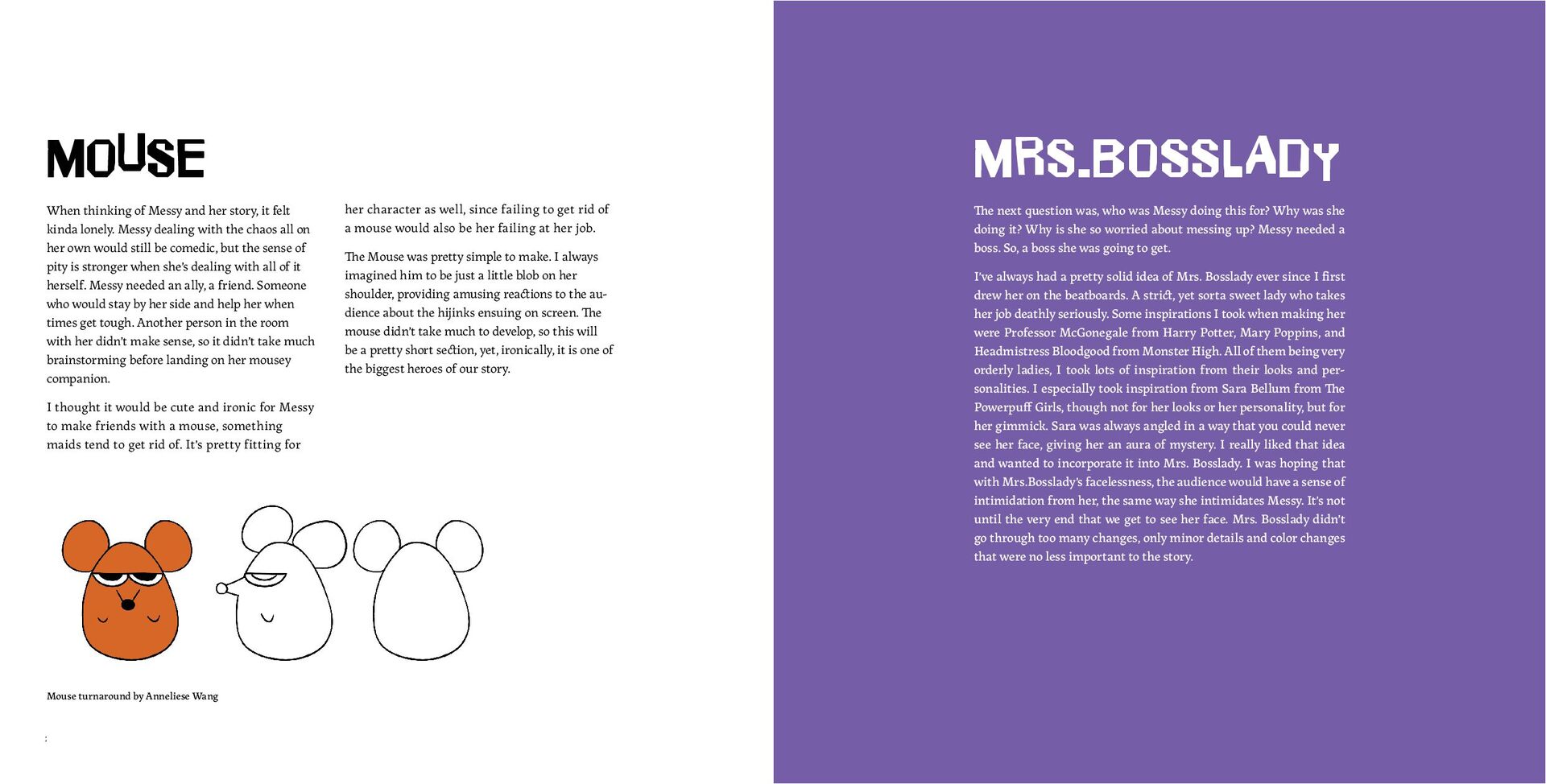 it felt kinda lonely. Messy dealing with the chaos all on her own would still be comedic, but the sense of pity is stronger when she’s dealing with all of it herself. Messy needed an ally, a friend. Someone who would stay by her side and help her when times get tough. Another person in the room with her didn’t make sense, so it didn’t take much brainstorming before landing on her mousey companion. I thought it would be cute and ironic for Messy to make friends with a mouse, something maids tend to get rid of. It’s pretty fitting for Mouse turnaround by Anneliese Wang her character as well, since failing to get rid of a mouse would also be her failing at her job. The Mouse was pretty simple to make. I always imagined him to be just a little blob on her shoulder, providing amusing reactions to the au- dience about the hijinks ensuing on screen. The mouse didn’t take much to develop, so this will be a pretty short section, yet, ironically, it is one of the biggest heroes of our story. Mrs.Bosslady The next question was, who was Messy doing this for? Why was she doing it? Why is she so worried about messing up? Messy needed a boss. So, a boss she was going to get. I’ve always had a pretty solid idea of Mrs. Bosslady ever since I first drew her on the beatboards. A strict, yet sorta sweet lady who takes her job deathly seriously. Some inspirations I took when making her were Professor McGonegale from Harry Potter, Mary Poppins, and Headmistress Bloodgood from Monster High. All of them being very orderly ladies, I took lots of inspiration from their looks and per- sonalities. I especially took inspiration from Sara Bellum from The Powerpuff Girls, though not for her looks or her personality, but for her gimmick. Sara was always angled in a way that you could never see her face, giving her an aura of mystery. I really liked that idea and wanted to incorporate it into Mrs. Bosslady. I was hoping that with Mrs.Bosslady’s facelessness, the audience would have a sense of intimidation from her, the same way she intimidates Messy. It’s not until the very end that we get to see her face. Mrs. Bosslady didn’t go through too many changes, only minor details and color changes that were no less important to the story.
