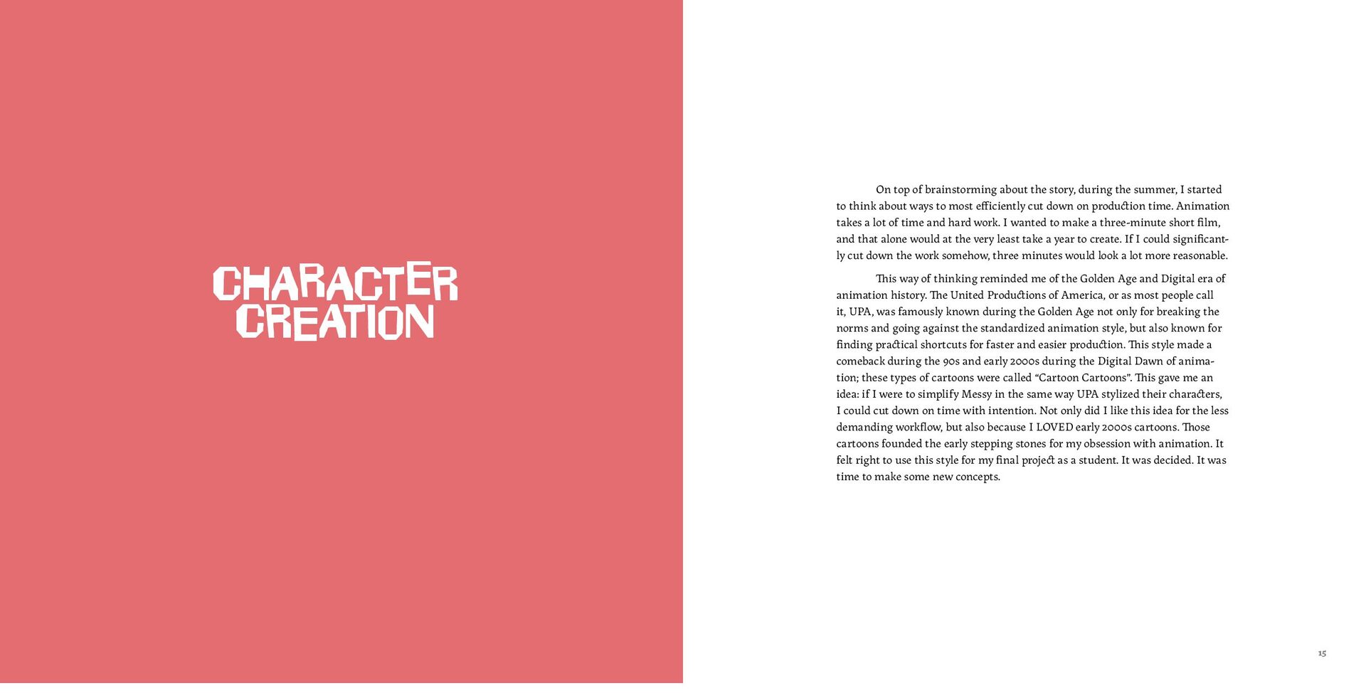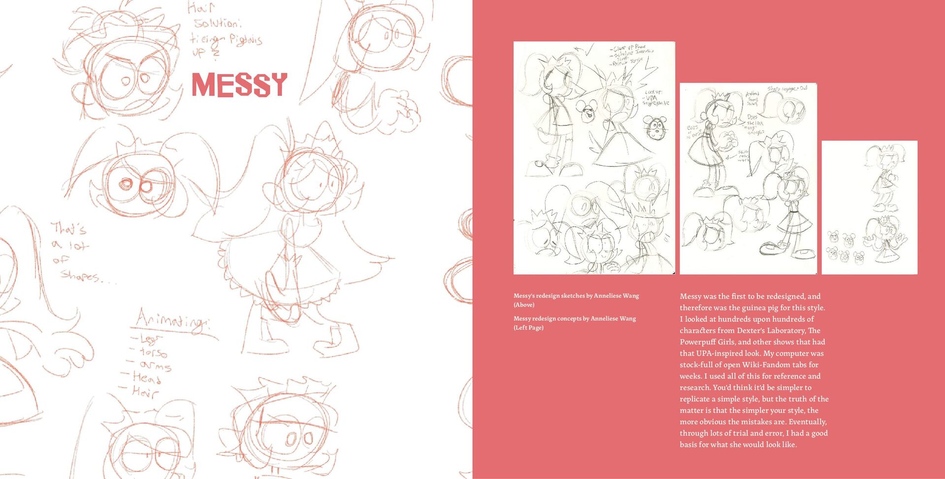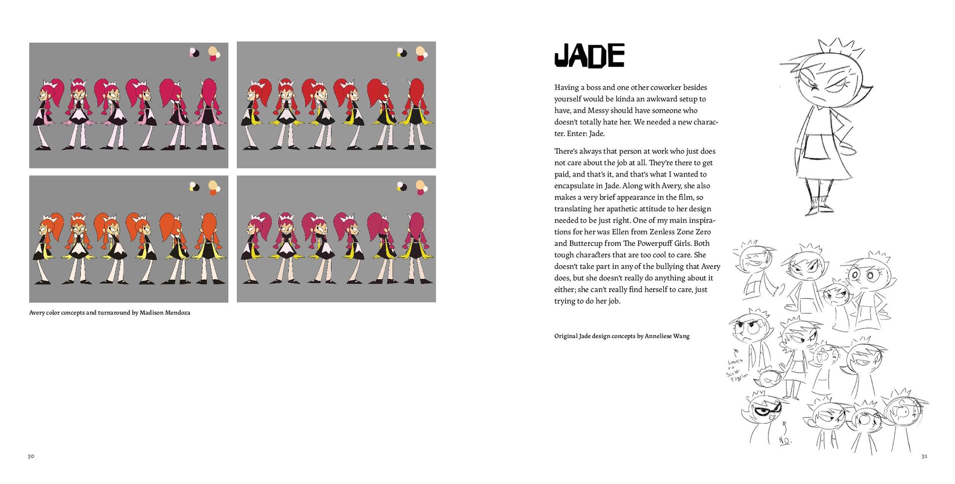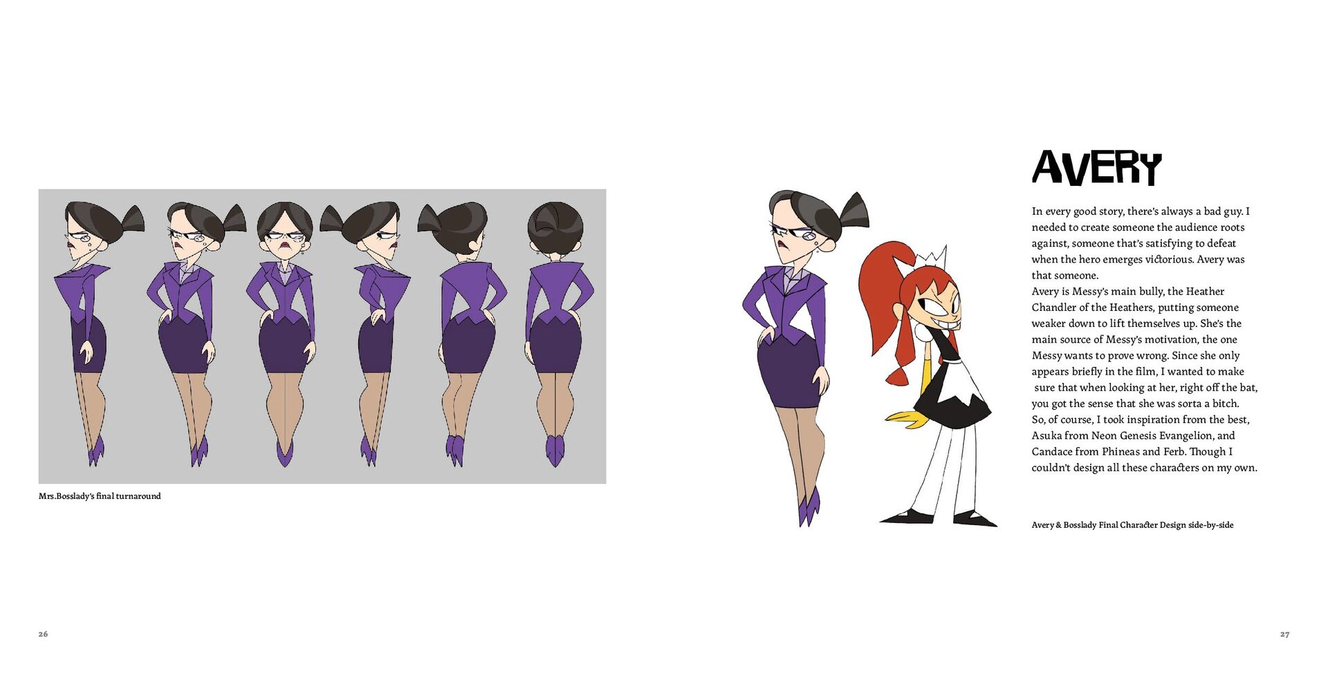 it felt kinda lonely. Messy dealing with the chaos all on her own would still be comedic, but the sense of pity is stronger when she’s dealing with all of it herself. Messy needed an ally, a friend. Someone who would stay by her side and help her when times get tough. Another person in the room with her didn’t make sense, so it didn’t take much brainstorming before landing on her mousey companion. I thought it would be cute and ironic for Messy to make friends with a mouse, something maids tend to get rid of. It’s pretty fitting for Mouse turnaround by Anneliese Wang her character as well, since failing to get rid of a mouse would also be her failing at her job. The Mouse was pretty simple to make. I always imagined him to be just a little blob on her shoulder, providing amusing reactions to the au- dience about the hijinks ensuing on screen. The mouse didn’t take much to develop, so this will be a pretty short section, yet, ironically, it is one of the biggest heroes of our story. Mrs.Bosslady The next question was, who was Messy doing this for? Why was she doing it? Why is she so worried about messing up? Messy needed a boss. So, a boss she was going to get. I’ve always had a pretty solid idea of Mrs. Bosslady ever since I first drew her on the beatboards. A strict, yet sorta sweet lady who takes her job deathly seriously. Some inspirations I took when making her were Professor McGonegale from Harry Potter, Mary Poppins, and Headmistress Bloodgood from Monster High. All of them being very orderly ladies, I took lots of inspiration from their looks and per- sonalities. I especially took inspiration from Sara Bellum from The Powerpuff Girls, though not for her looks or her personality, but for her gimmick. Sara was always angled in a way that you could never see her face, giving her an aura of mystery. I really liked that idea and wanted to incorporate it into Mrs. Bosslady. I was hoping that with Mrs.Bosslady’s facelessness, the audience would have a sense of intimidation from her, the same way she intimidates Messy. It’s not until the very end that we get to see her face. Mrs. Bosslady didn’t go through too many changes, only minor details and color changes that were no less important to the story.