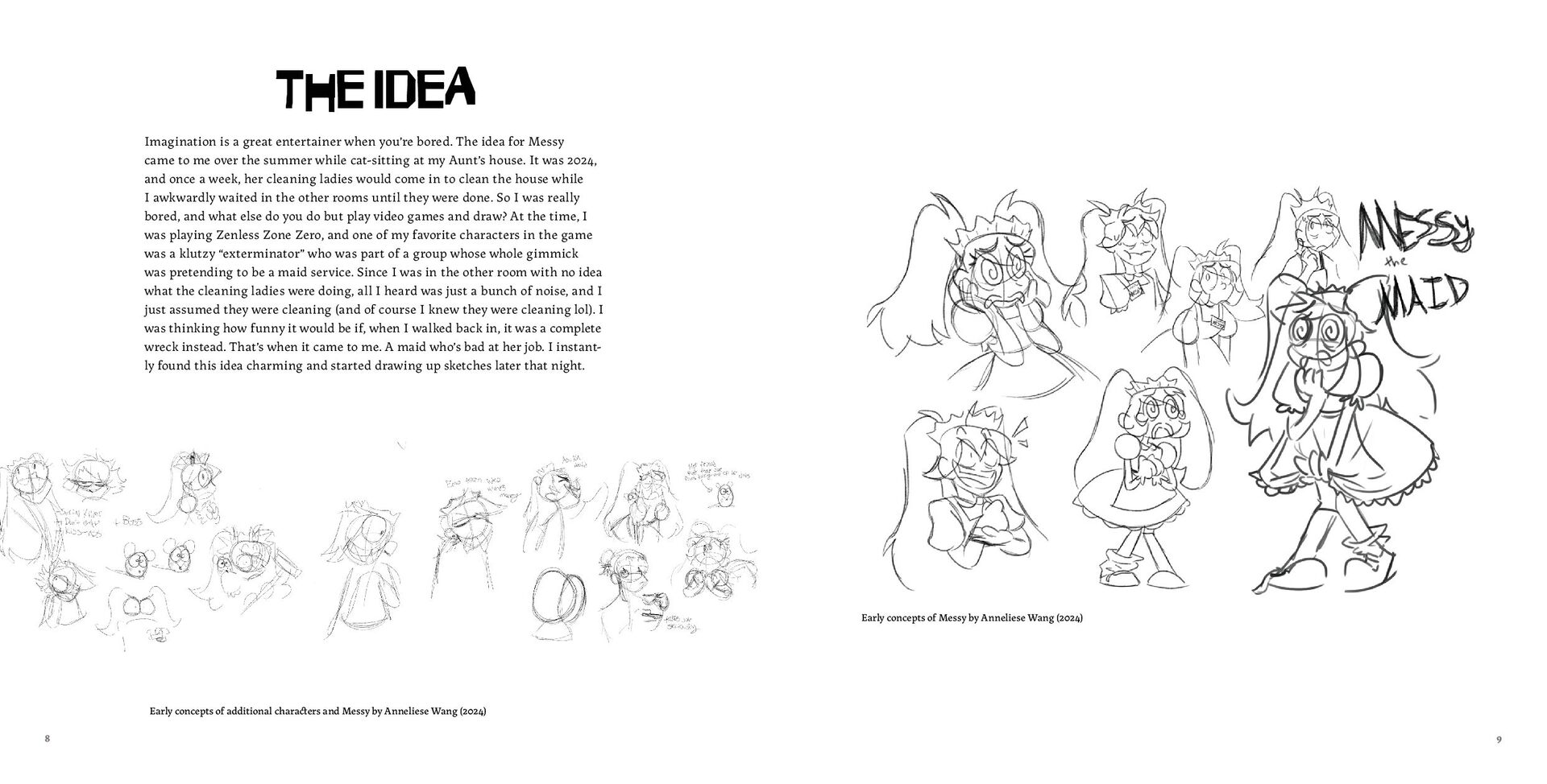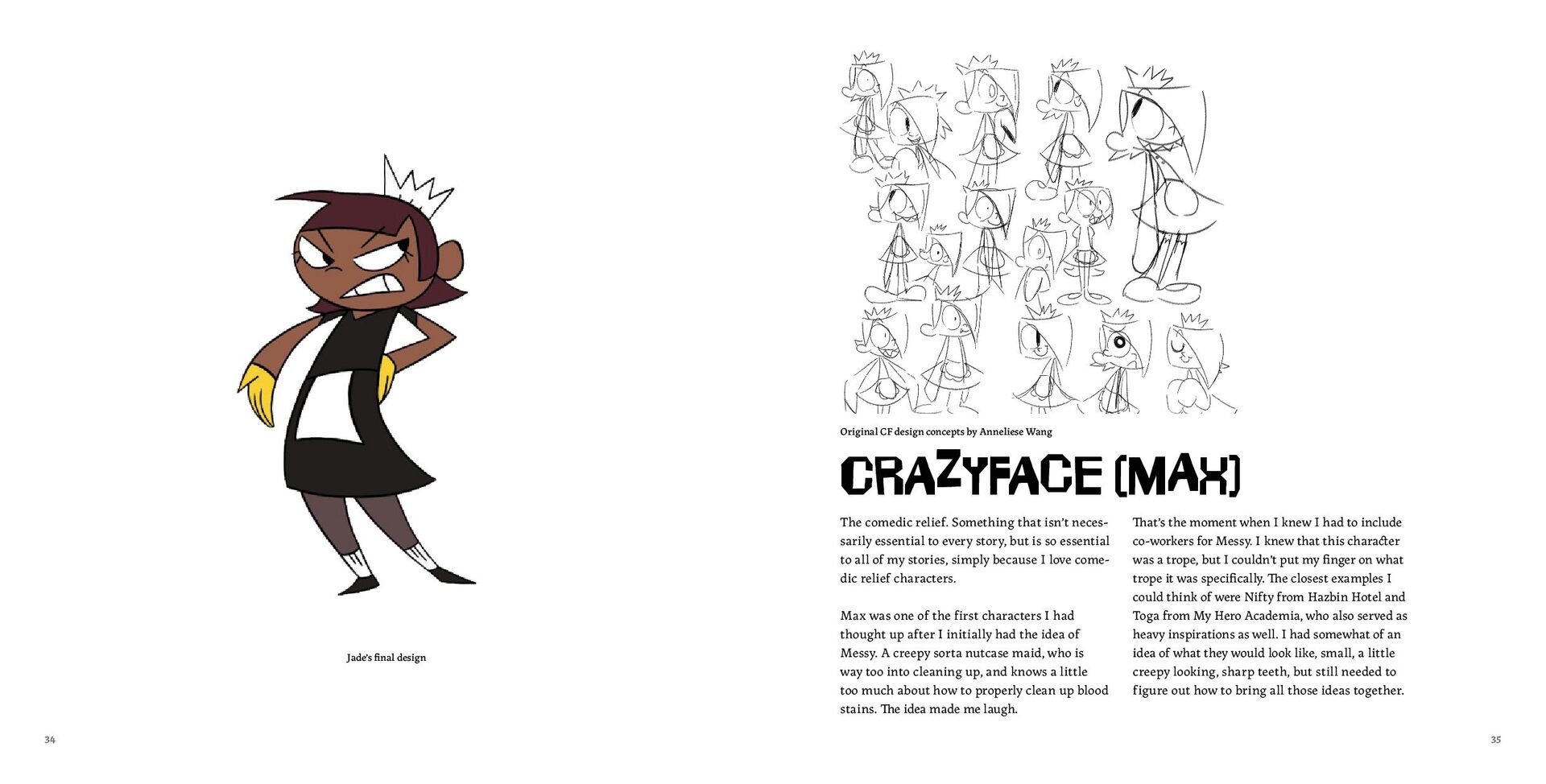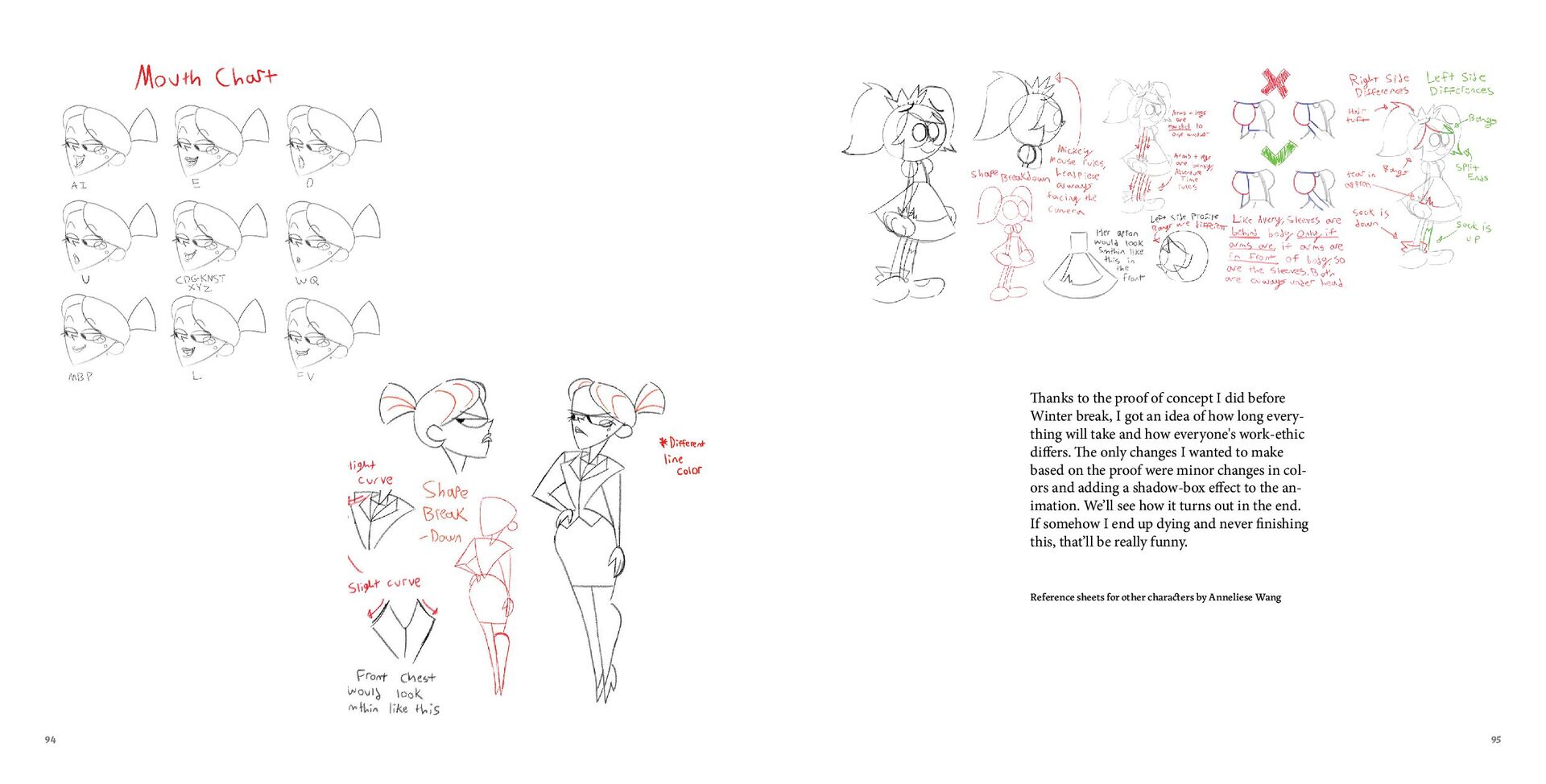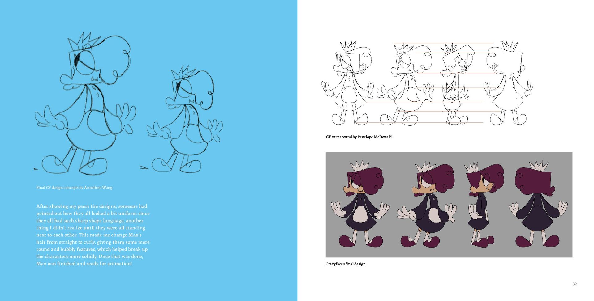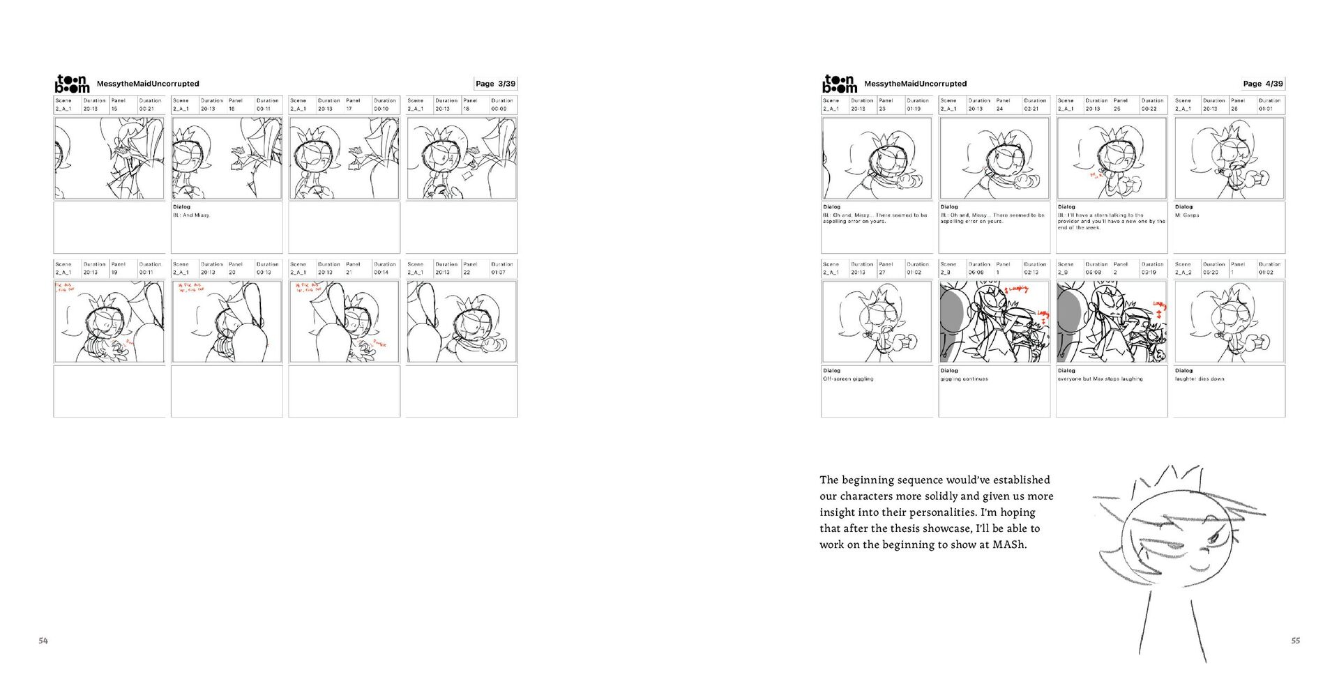 it felt kinda lonely. Messy dealing with the chaos all on her own would still be comedic, but the sense of pity is stronger when she’s dealing with all of it herself. Messy needed an ally, a friend. Someone who would stay by her side and help her when times get tough. Another person in the room with her didn’t make sense, so it didn’t take much brainstorming before landing on her mousey companion. I thought it would be cute and ironic for Messy to make friends with a mouse, something maids tend to get rid of. It’s pretty fitting for Mouse turnaround by Anneliese Wang her character as well, since failing to get rid of a mouse would also be her failing at her job. The Mouse was pretty simple to make. I always imagined him to be just a little blob on her shoulder, providing amusing reactions to the au- dience about the hijinks ensuing on screen. The mouse didn’t take much to develop, so this will be a pretty short section, yet, ironically, it is one of the biggest heroes of our story. Mrs.Bosslady The next question was, who was Messy doing this for? Why was she doing it? Why is she so worried about messing up? Messy needed a boss. So, a boss she was going to get. I’ve always had a pretty solid idea of Mrs. Bosslady ever since I first drew her on the beatboards. A strict, yet sorta sweet lady who takes her job deathly seriously. Some inspirations I took when making her were Professor McGonegale from Harry Potter, Mary Poppins, and Headmistress Bloodgood from Monster High. All of them being very orderly ladies, I took lots of inspiration from their looks and per- sonalities. I especially took inspiration from Sara Bellum from The Powerpuff Girls, though not for her looks or her personality, but for her gimmick. Sara was always angled in a way that you could never see her face, giving her an aura of mystery. I really liked that idea and wanted to incorporate it into Mrs. Bosslady. I was hoping that with Mrs.Bosslady’s facelessness, the audience would have a sense of intimidation from her, the same way she intimidates Messy. It’s not until the very end that we get to see her face. Mrs. Bosslady didn’t go through too many changes, only minor details and color changes that were no less important to the story.