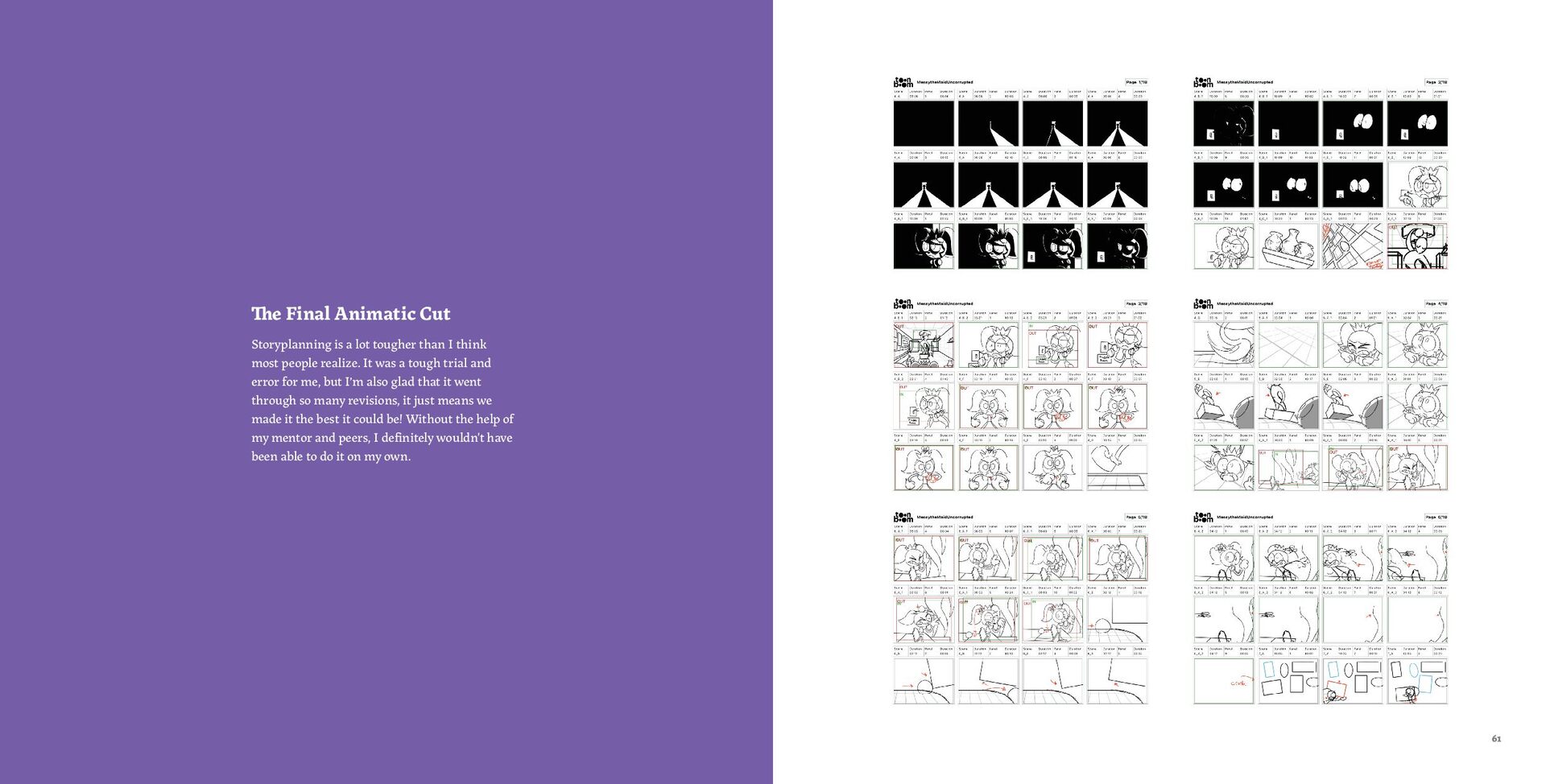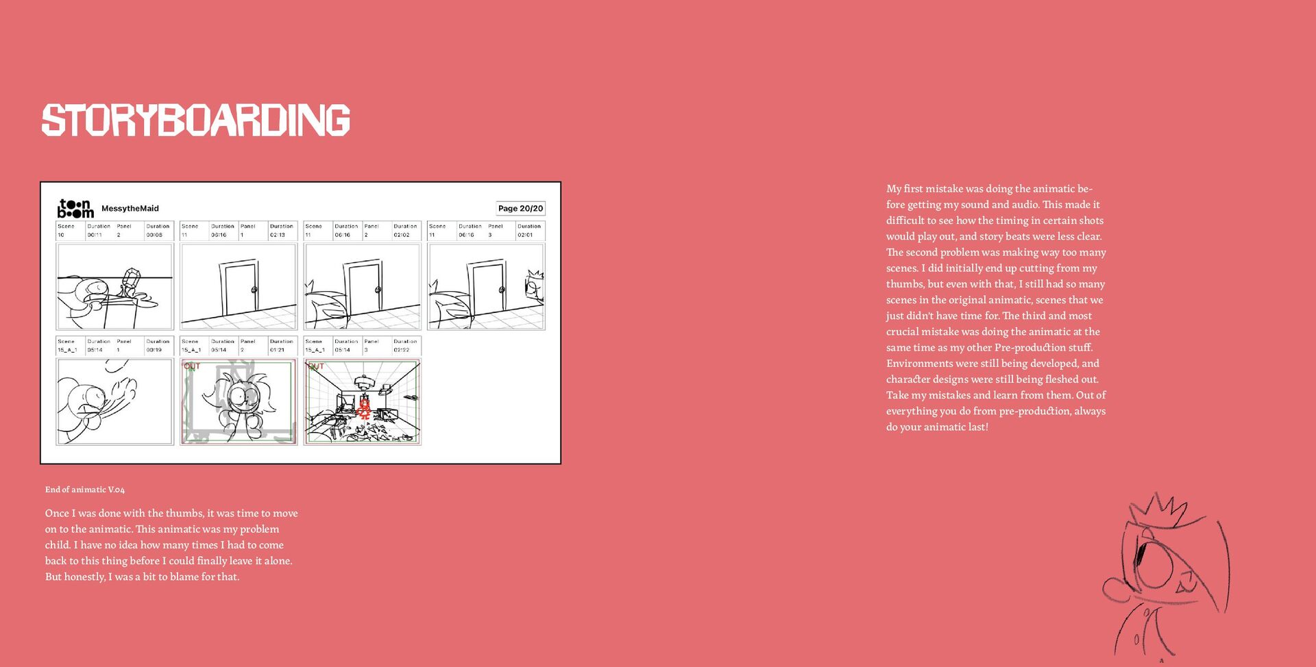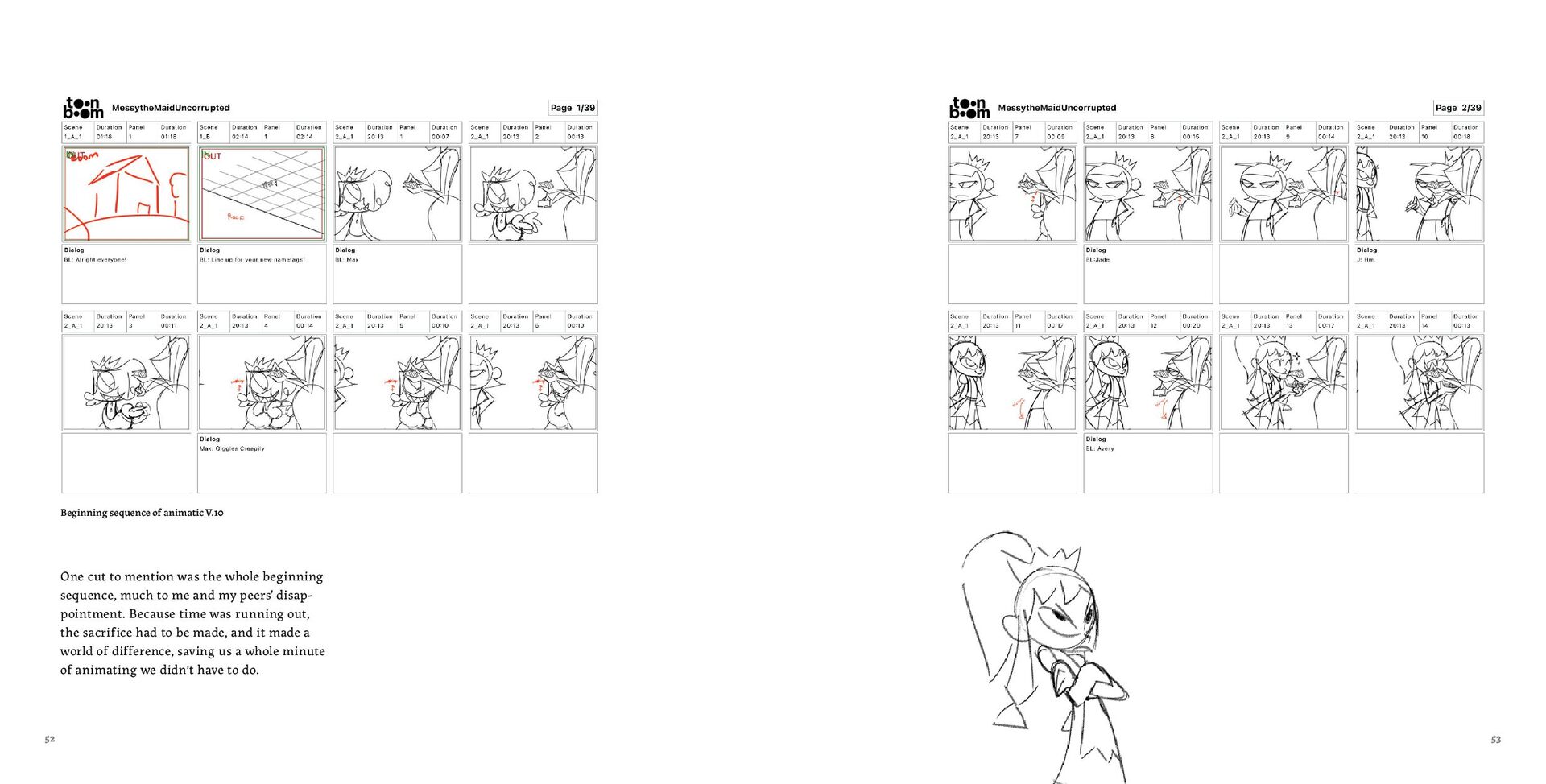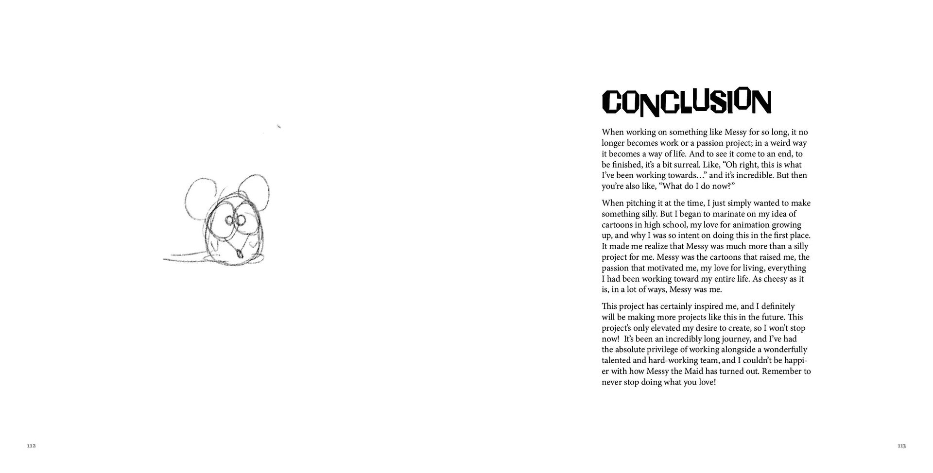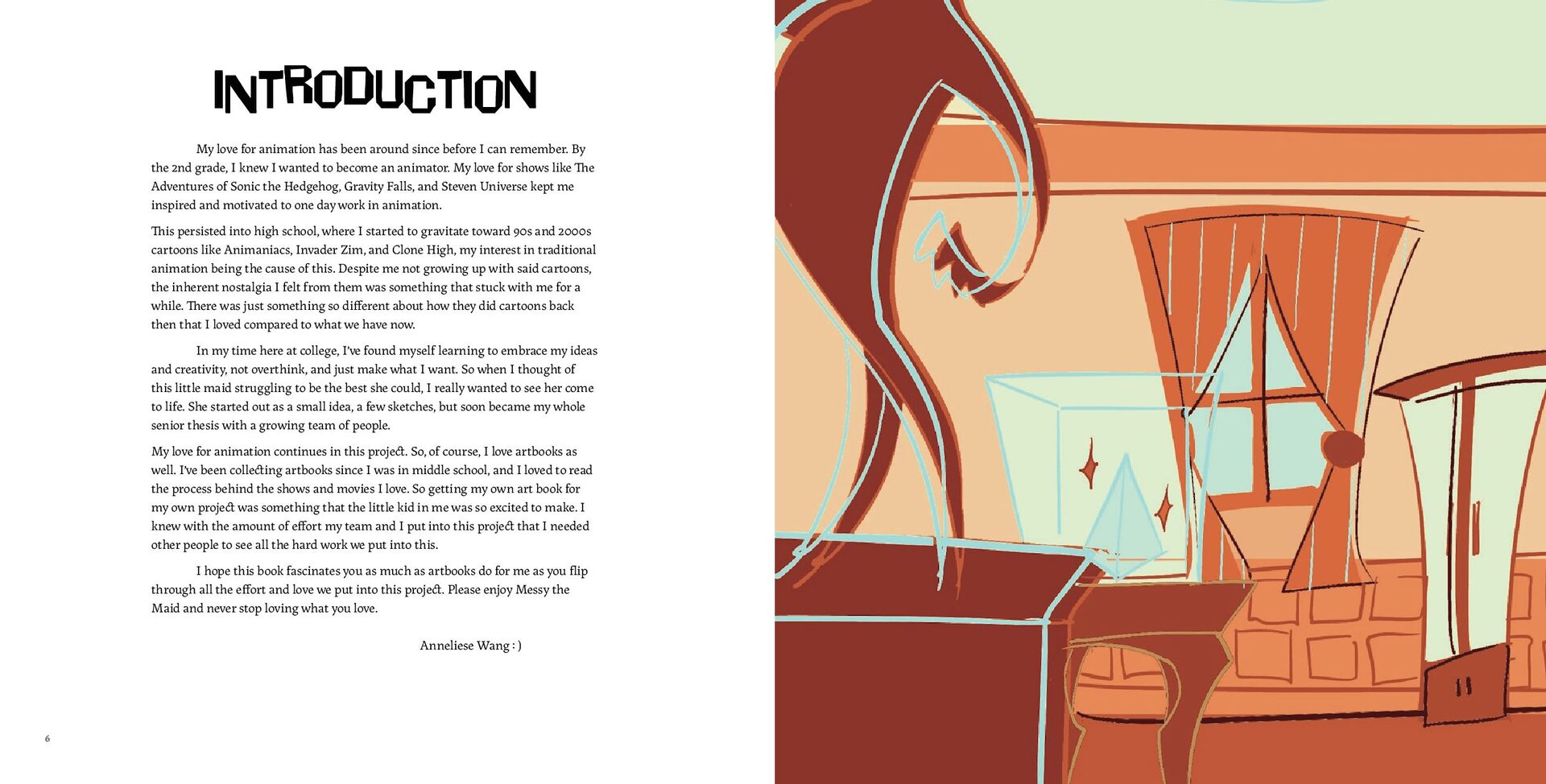 it felt kinda lonely. Messy dealing with the chaos all on her own would still be comedic, but the sense of pity is stronger when she’s dealing with all of it herself. Messy needed an ally, a friend. Someone who would stay by her side and help her when times get tough. Another person in the room with her didn’t make sense, so it didn’t take much brainstorming before landing on her mousey companion. I thought it would be cute and ironic for Messy to make friends with a mouse, something maids tend to get rid of. It’s pretty fitting for Mouse turnaround by Anneliese Wang her character as well, since failing to get rid of a mouse would also be her failing at her job. The Mouse was pretty simple to make. I always imagined him to be just a little blob on her shoulder, providing amusing reactions to the au- dience about the hijinks ensuing on screen. The mouse didn’t take much to develop, so this will be a pretty short section, yet, ironically, it is one of the biggest heroes of our story. Mrs.Bosslady The next question was, who was Messy doing this for? Why was she doing it? Why is she so worried about messing up? Messy needed a boss. So, a boss she was going to get. I’ve always had a pretty solid idea of Mrs. Bosslady ever since I first drew her on the beatboards. A strict, yet sorta sweet lady who takes her job deathly seriously. Some inspirations I took when making her were Professor McGonegale from Harry Potter, Mary Poppins, and Headmistress Bloodgood from Monster High. All of them being very orderly ladies, I took lots of inspiration from their looks and per- sonalities. I especially took inspiration from Sara Bellum from The Powerpuff Girls, though not for her looks or her personality, but for her gimmick. Sara was always angled in a way that you could never see her face, giving her an aura of mystery. I really liked that idea and wanted to incorporate it into Mrs. Bosslady. I was hoping that with Mrs.Bosslady’s facelessness, the audience would have a sense of intimidation from her, the same way she intimidates Messy. It’s not until the very end that we get to see her face. Mrs. Bosslady didn’t go through too many changes, only minor details and color changes that were no less important to the story.