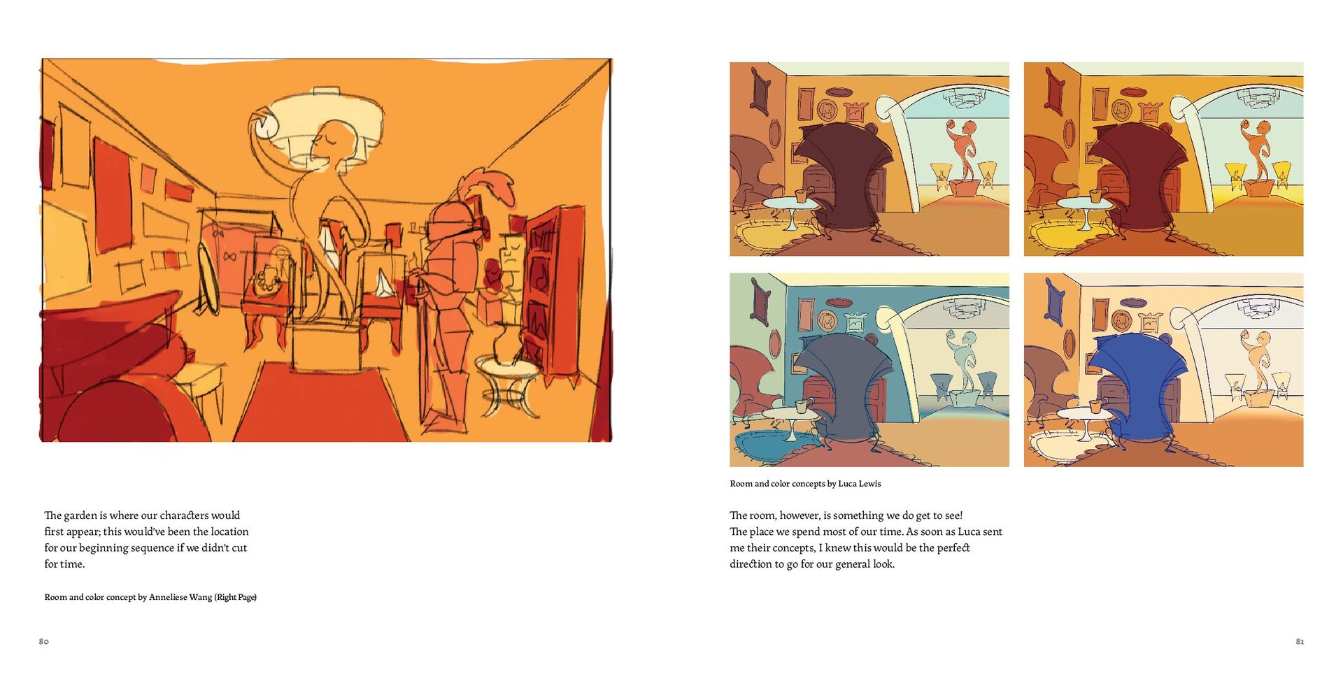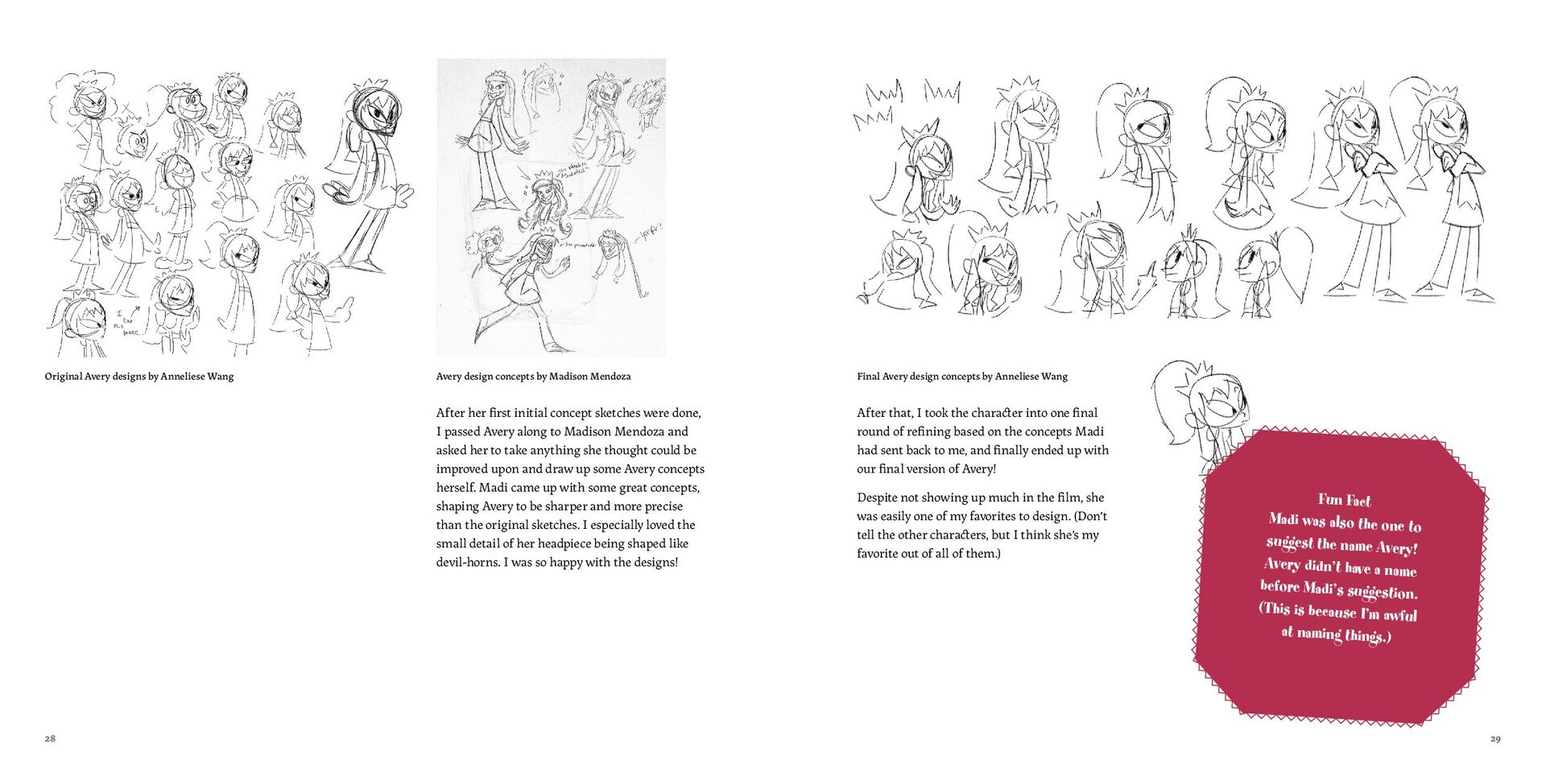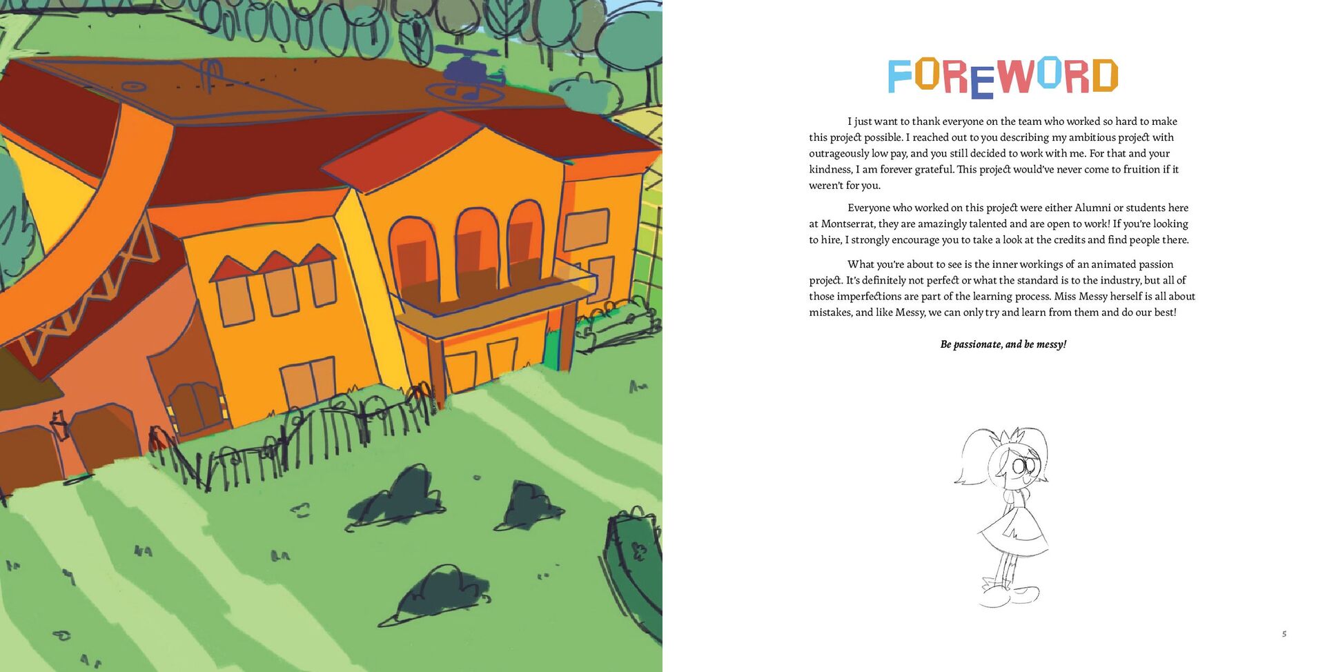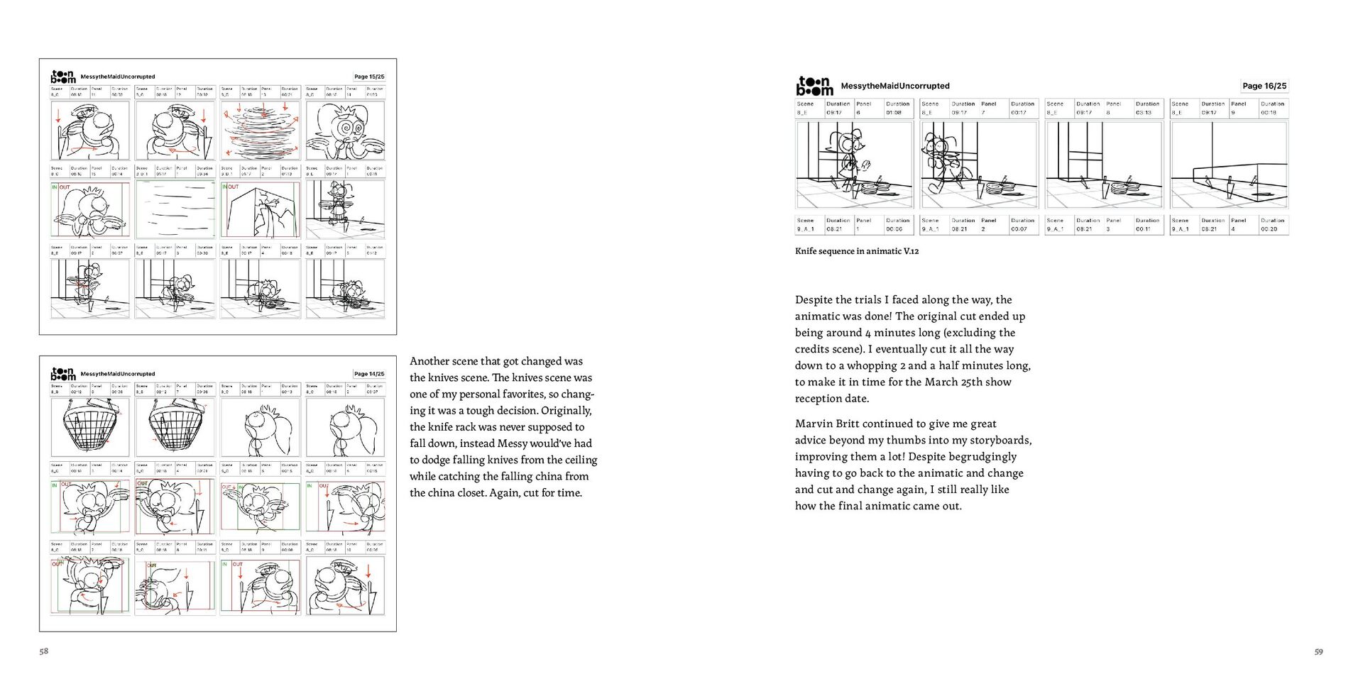 it felt kinda lonely. Messy dealing with the chaos all on her own would still be comedic, but the sense of pity is stronger when she’s dealing with all of it herself. Messy needed an ally, a friend. Someone who would stay by her side and help her when times get tough. Another person in the room with her didn’t make sense, so it didn’t take much brainstorming before landing on her mousey companion. I thought it would be cute and ironic for Messy to make friends with a mouse, something maids tend to get rid of. It’s pretty fitting for Mouse turnaround by Anneliese Wang her character as well, since failing to get rid of a mouse would also be her failing at her job. The Mouse was pretty simple to make. I always imagined him to be just a little blob on her shoulder, providing amusing reactions to the au- dience about the hijinks ensuing on screen. The mouse didn’t take much to develop, so this will be a pretty short section, yet, ironically, it is one of the biggest heroes of our story. Mrs.Bosslady The next question was, who was Messy doing this for? Why was she doing it? Why is she so worried about messing up? Messy needed a boss. So, a boss she was going to get. I’ve always had a pretty solid idea of Mrs. Bosslady ever since I first drew her on the beatboards. A strict, yet sorta sweet lady who takes her job deathly seriously. Some inspirations I took when making her were Professor McGonegale from Harry Potter, Mary Poppins, and Headmistress Bloodgood from Monster High. All of them being very orderly ladies, I took lots of inspiration from their looks and per- sonalities. I especially took inspiration from Sara Bellum from The Powerpuff Girls, though not for her looks or her personality, but for her gimmick. Sara was always angled in a way that you could never see her face, giving her an aura of mystery. I really liked that idea and wanted to incorporate it into Mrs. Bosslady. I was hoping that with Mrs.Bosslady’s facelessness, the audience would have a sense of intimidation from her, the same way she intimidates Messy. It’s not until the very end that we get to see her face. Mrs. Bosslady didn’t go through too many changes, only minor details and color changes that were no less important to the story.