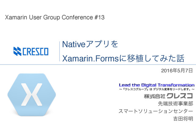 NativeΞϓϦΛ Xamarin.FormsʹҠ২ͯ͠Έͨ 20165݄7 ઌٕज़ࣄۀ෦ εϚʔτιϦϡʔγϣϯηϯλʔ ٢ాক໌ Xamarin User Group Conference