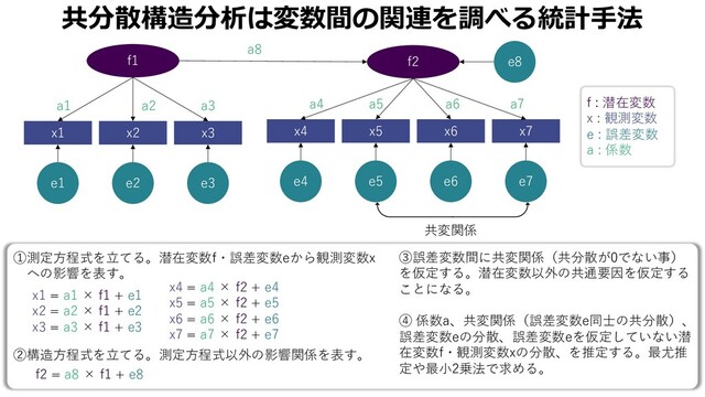 : 潜在変数 x : 観測変数 e : 誤差変数 a : 係数 f2 f1 x4 x5 x6 x7 x1 x2 x3 e4 e5 e6 e7 e1 e2 e3 e8 a5 a6 a2 a4 a7 a1 a3 ①測定⽅程式を⽴てる。潜在変数f・誤差変数eから観測変数x への影響を表す。 x4 = a4 × f2 + e4 x5 = a5 × f2 + e5 x6 = a6 × f2 + e6 x7 = a7 × f2 + e7 x1 = a1 × f1 + e1 x2 = a2 × f1 + e2 x3 = a3 × f1 + e3 f2 = a8 × f1 + e8 共変関係 ②構造⽅程式を⽴てる。測定⽅程式以外の影響関係を表す。 a8
