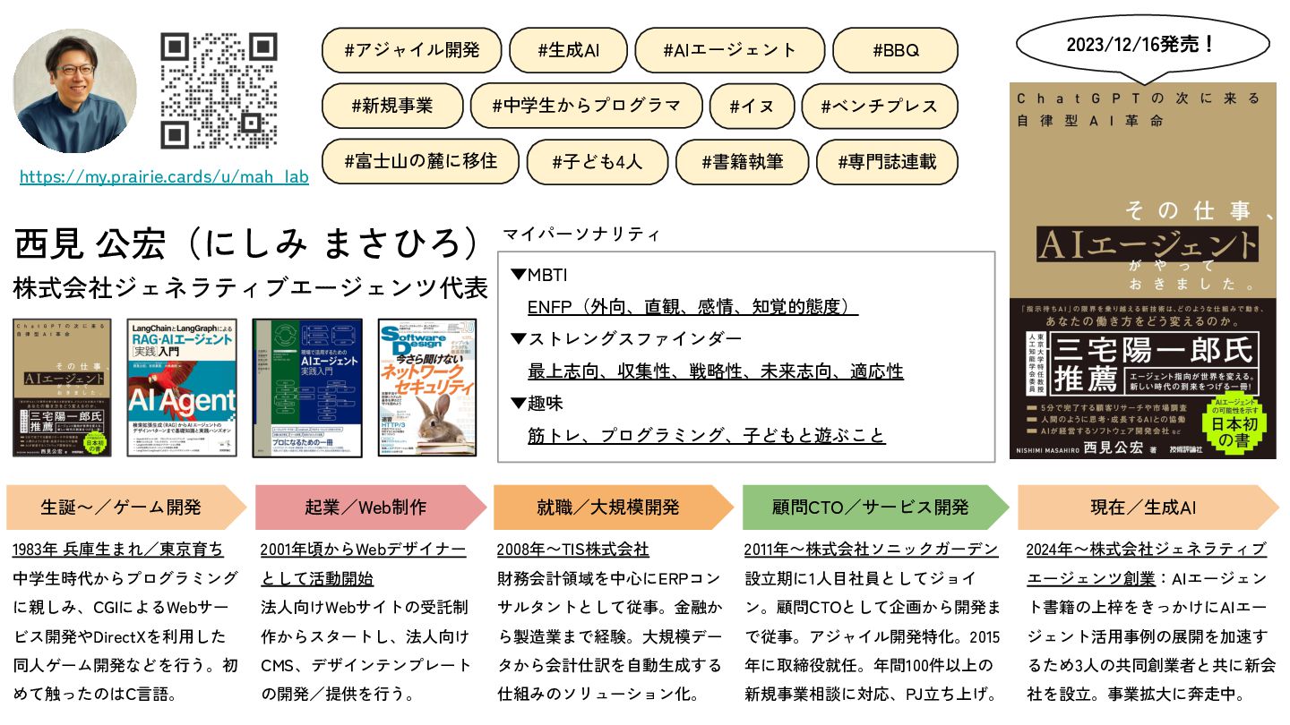生誕〜/ゲーム開発 1983年 兵庫生まれ/東京育ち 中学生時代からプログラミング に親しみ、CGIによるWebサー ビス開発やDirectXを利用した 同人ゲーム開発などを行う。初 めて触ったのはC言語。 起業/Web制作 2001年頃からWebデザイナー として活動開始 法人向けWebサイトの受託制 作からスタートし、法人向け CMS、デザインテンプレート の開発/提供を行う。 就職/大規模開発 顧問CTO/サービス開発 現在/生成AI 2008年〜TIS株式会社 財務会計領域を中心にERPコン サルタントとして従事。金融か ら製造業まで経験。大規模デー タから会計仕訳を自動生成する 仕組みのソリューション化。 2011年〜株式会社ソニックガーデン 設立期に1人目社員としてジョイ ン。顧問CTOとして企画から開発ま で従事。アジャイル開発特化。2015 年に取締役就任。年間100件以上の 新規事業相談に対応、PJ立ち上げ。 2024年〜株式会社ジェネラティブ エージェンツ創業:AIエージェン ト書籍の上梓をきっかけにAIエー ジェント活用事例の展開を加速す るため3人の共同創業者と共に新会 社を設立。事業拡大に奔走中。 https://my.prairie.cards/u/mah_lab 2023/12/16発売! #専門誌連載 #書籍執筆 ▼MBTI  ENFP(外向、直観、感情、知覚的態度) ▼ストレングスファインダー  最上志向、収集性、戦略性、未来志向、適応性 ▼趣味  筋トレ、プログラミング、子どもと遊ぶこと マイパーソナリティ #子ども4人 #イヌ #ベンチプレス #BBQ