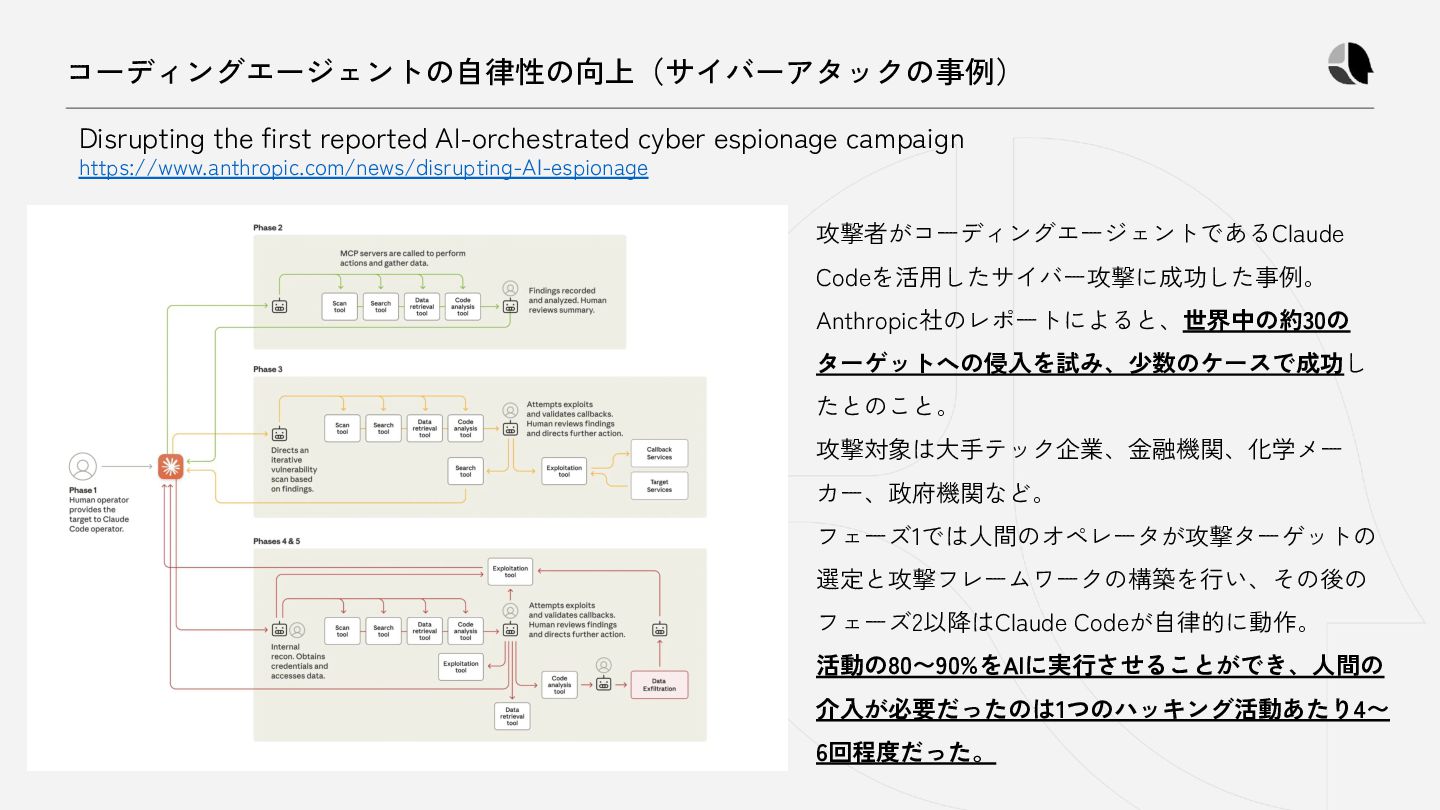 4. コーディングエージェントの自律性の向上(サイバーアタックの事例) Disrupting the first reported AI-orchestrated cyber espionage campaign https://www.anthropic.com/news/disrupting-AI-espionage
