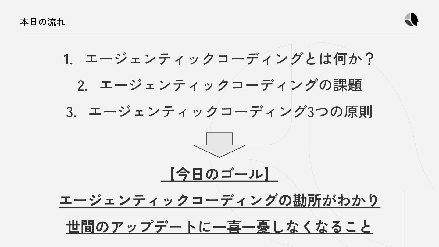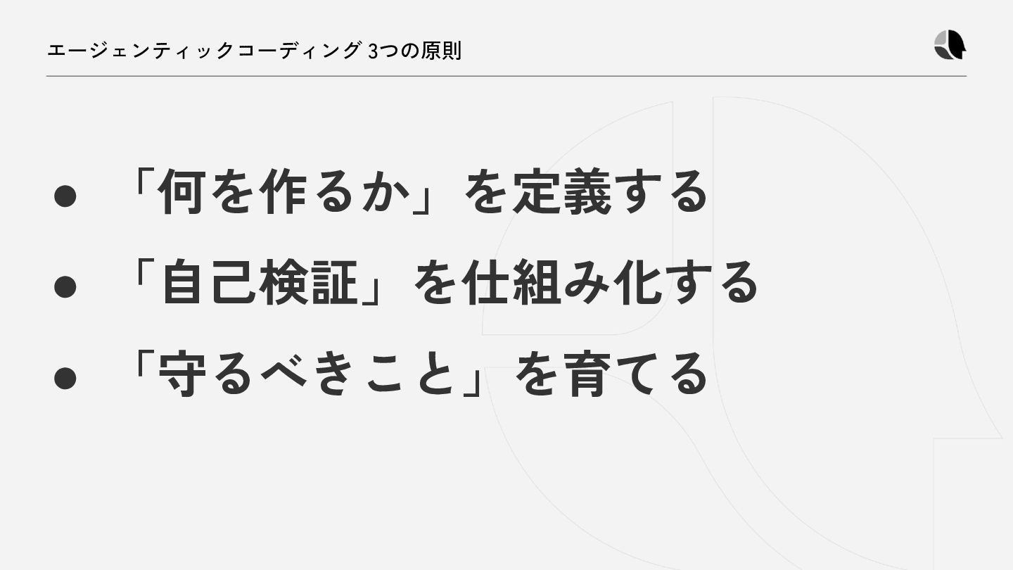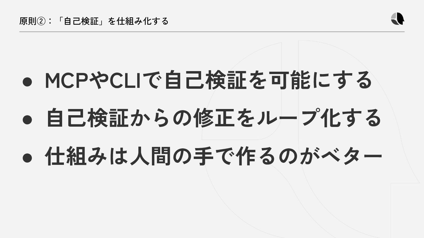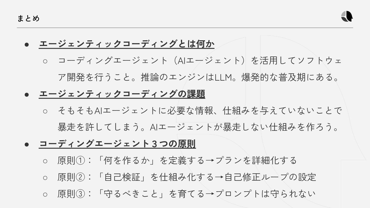 暴走を許してしまう。AIエージェントが暴走しない仕組みを作ろう。 • コーディングエージェント3つの原則 ◦ 原則①:「何を作るか」を定義する→プランを詳細化する ◦ 原則②:「自己検証」を仕組み化する→自己修正ループの設定 ◦ 原則③:「守るべきこと」を育てる→プロンプトは守られない