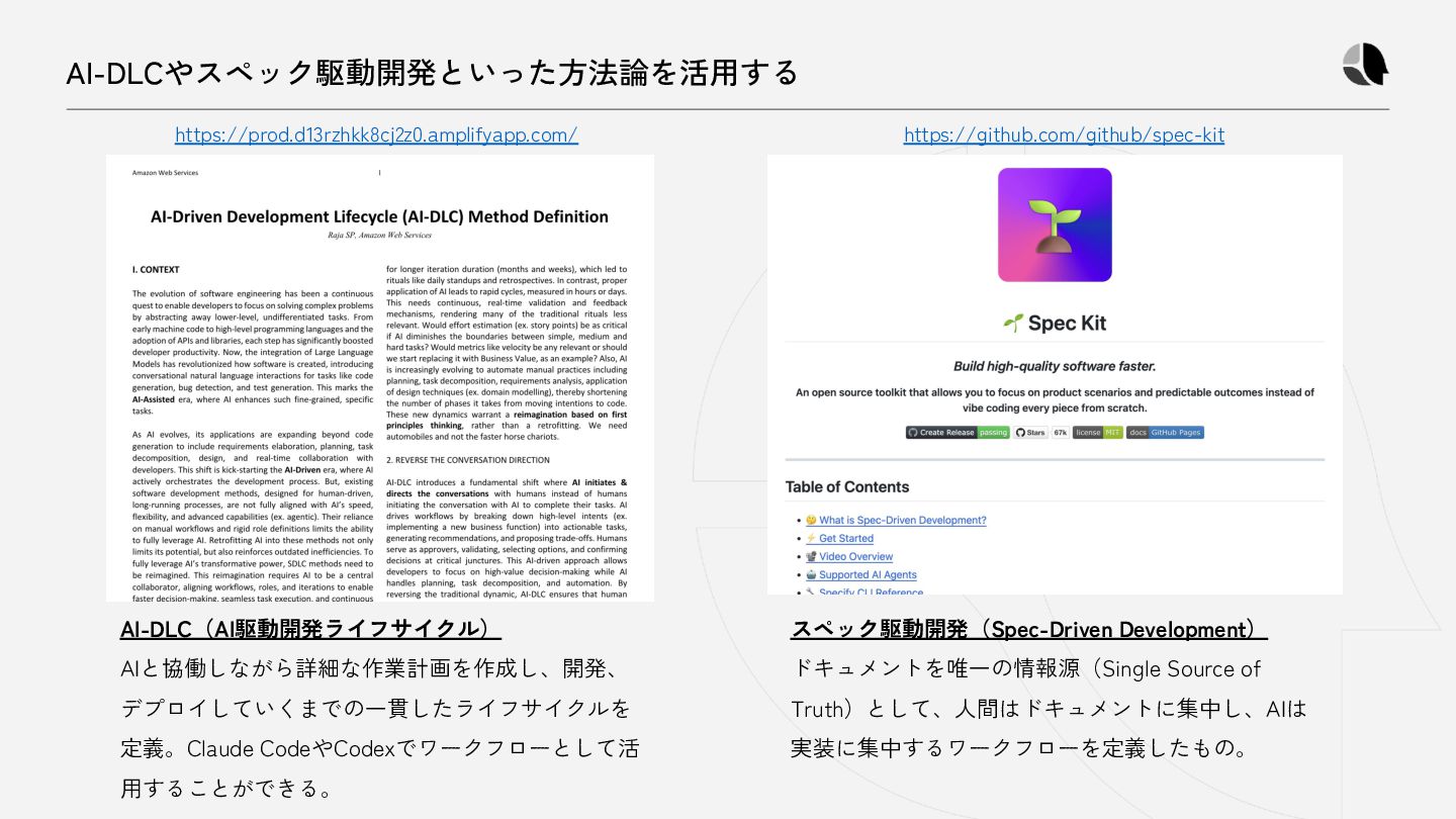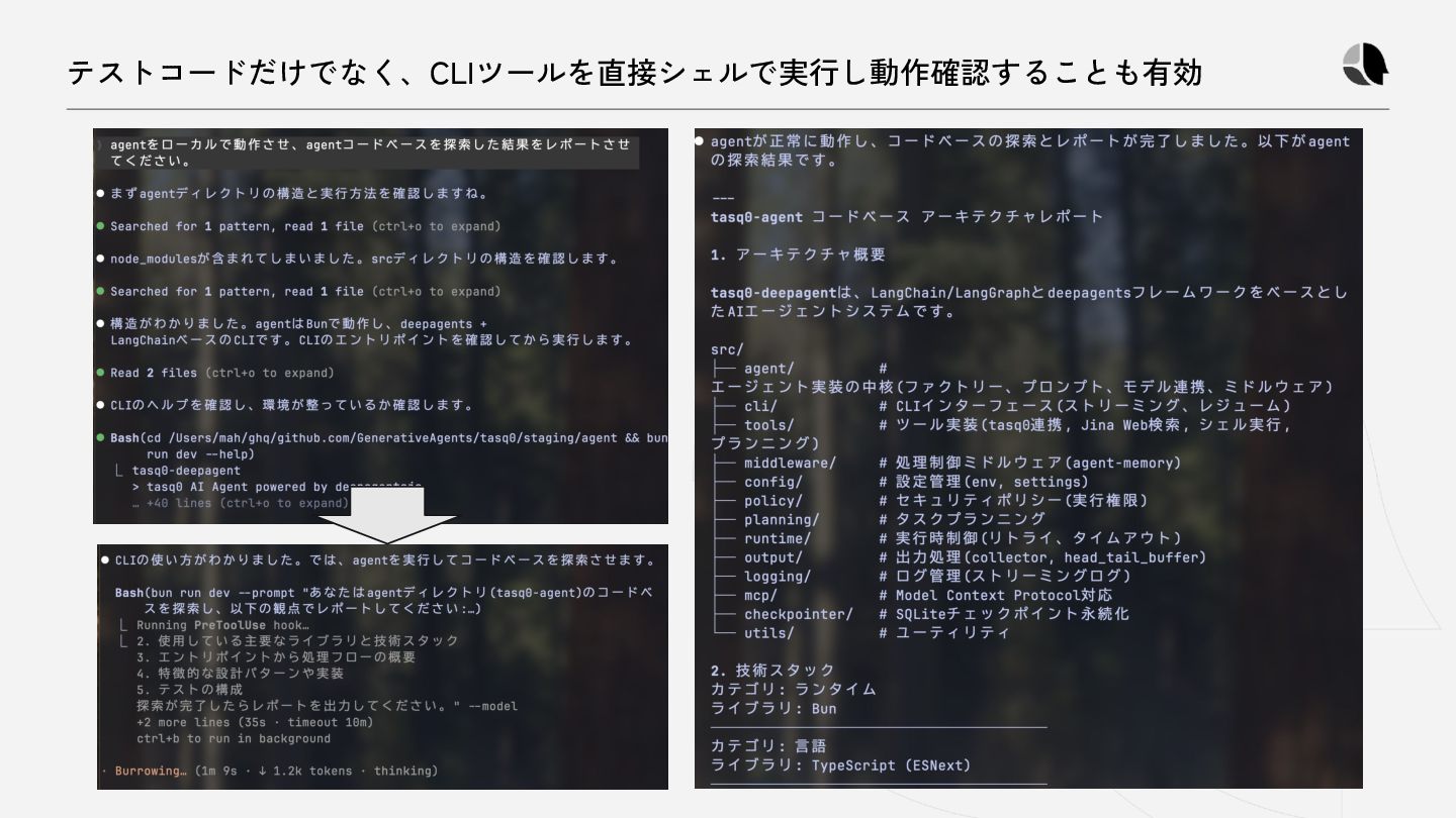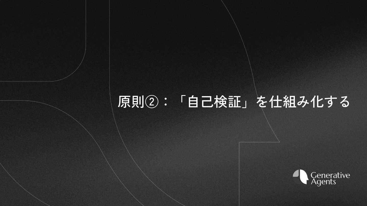 暴走を許してしまう。AIエージェントが暴走しない仕組みを作ろう。 • コーディングエージェント3つの原則 ◦ 原則①:「何を作るか」を定義する→プランを詳細化する ◦ 原則②:「自己検証」を仕組み化する→自己修正ループの設定 ◦ 原則③:「守るべきこと」を育てる→プロンプトは守られない