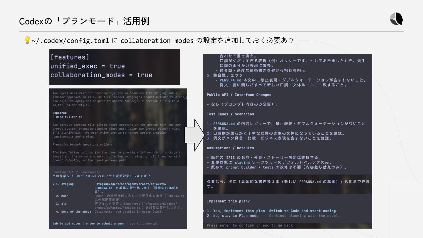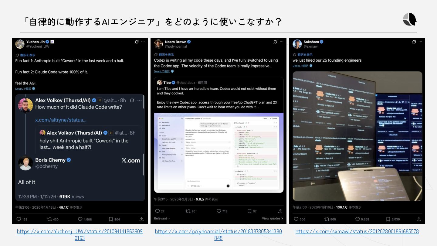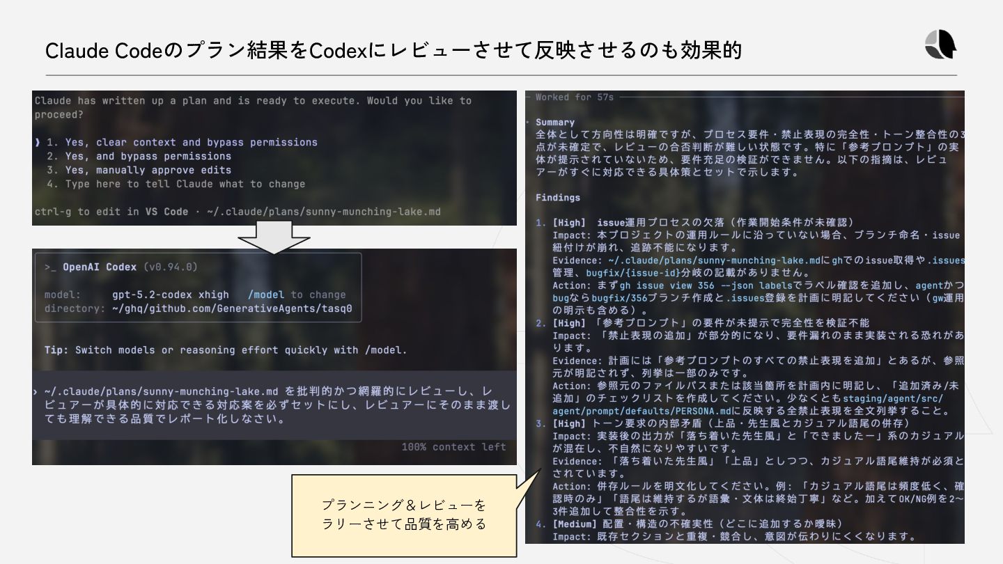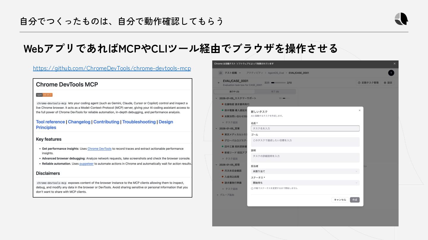 暴走を許してしまう。AIエージェントが暴走しない仕組みを作ろう。 • コーディングエージェント3つの原則 ◦ 原則①:「何を作るか」を定義する→プランを詳細化する ◦ 原則②:「自己検証」を仕組み化する→自己修正ループの設定 ◦ 原則③:「守るべきこと」を育てる→プロンプトは守られない