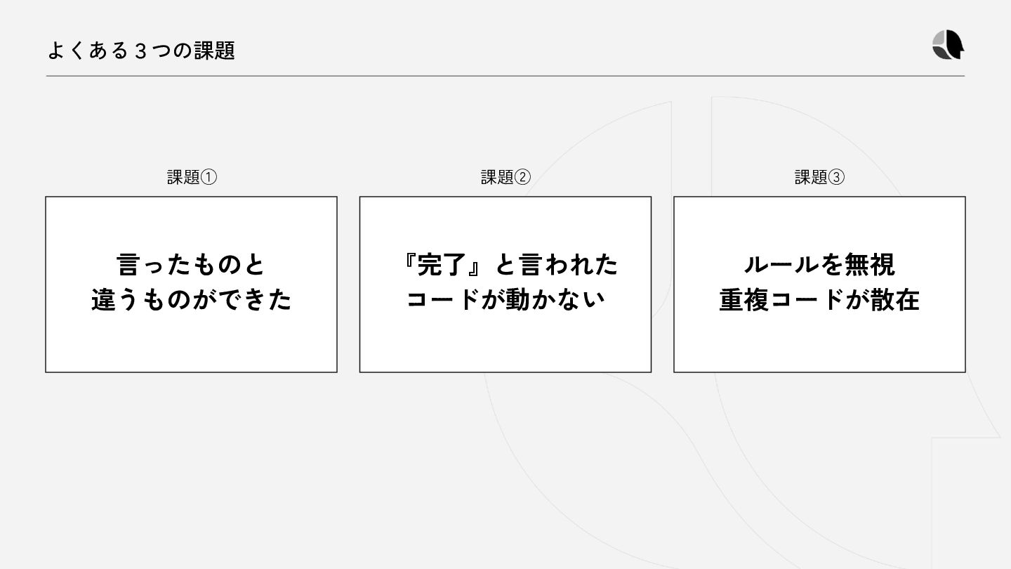 7. よくある3つの課題 言ったものと 違うものができた 『完了』と言われた コードが動かない ルールを無視 重複コードが散在 課題① 課題② 課題③