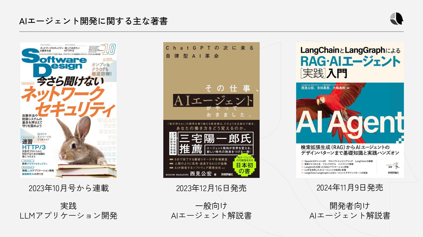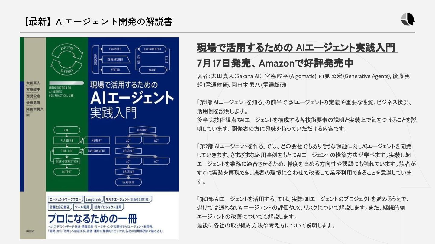 2. 【最新】AIエージェント開発の解説書 現場で活用するための AIエージェント実践入門 7月17日発売、Amazonで好評発売中 著者:太田 真人(Sakana AI), 宮脇 峻平 (Algomatic),