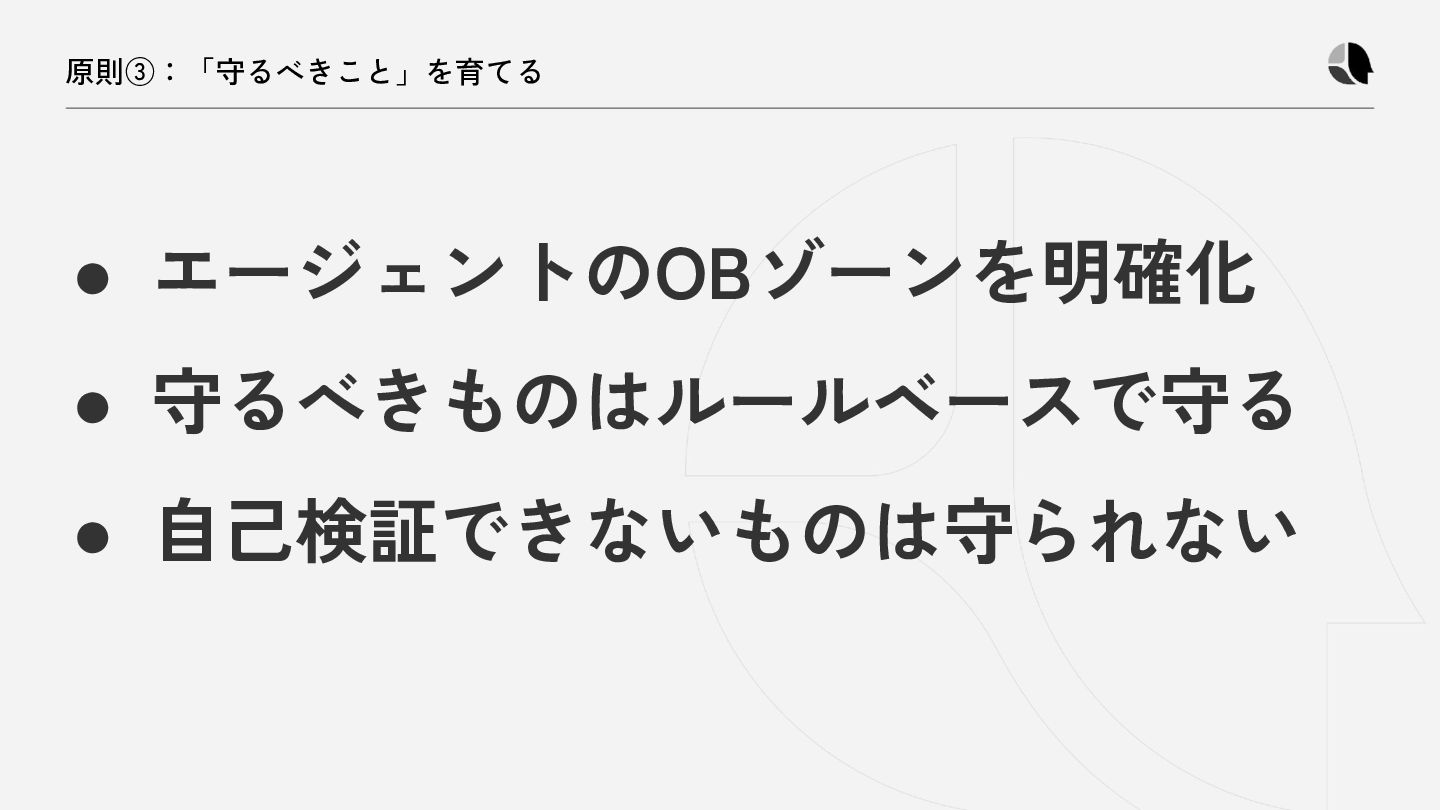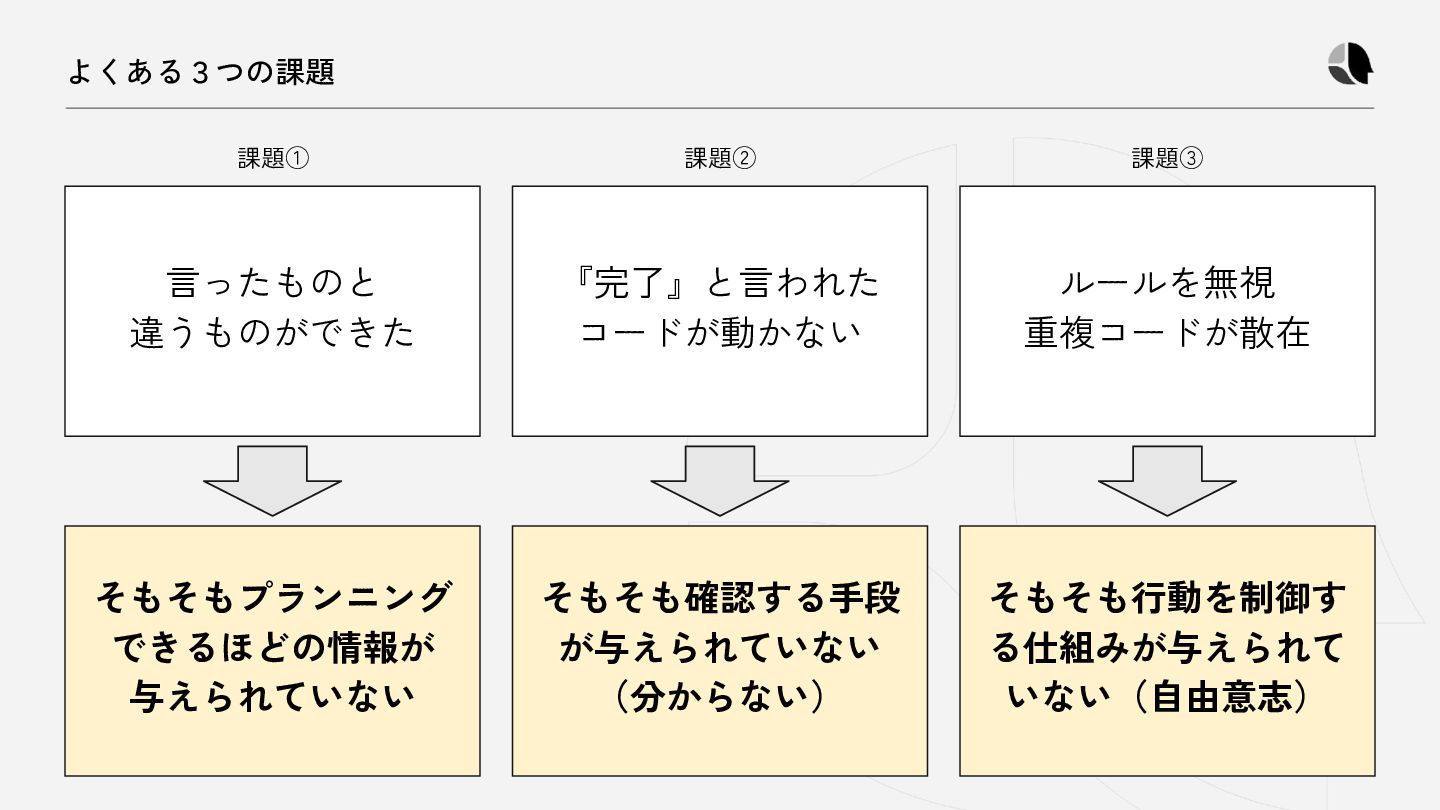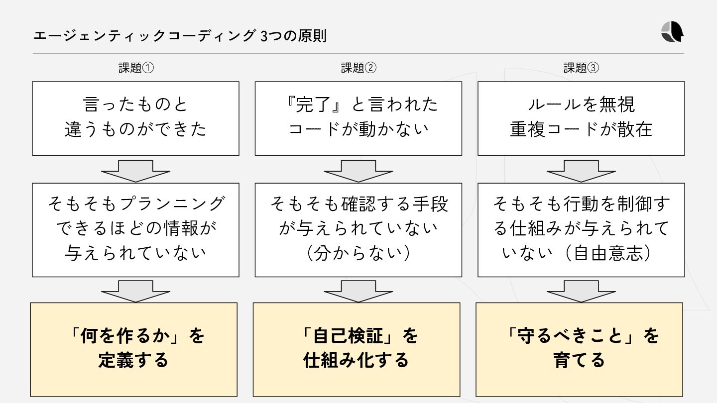 課題③ そもそもプランニング できるほどの情報が 与えられていない そもそも確認する手段 が与えられていない (分からない) そもそも行動を制御す る仕組みが与えられて いない(自由意志) 「何を作るか」を 定義する 「自己検証」を 仕組み化する 「守るべきこと」を 育てる