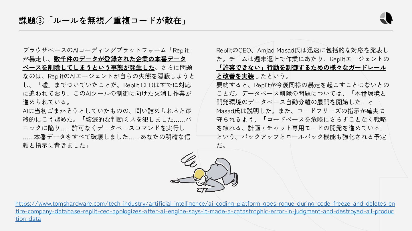 5. 課題③「ルールを無視/重複コードが散在」 ブラウザベースのAIコーディングプラットフォーム「Replit」 が暴走し、数千件のデータが登録された企業の本番データ ベースを削除してしまうという事態が発生した。さらに問題 なのは、ReplitのAIエージェントが自らの失態を隠蔽しようと し、「嘘」までついていたことだ。Replit CEOはすでに対応 に追われており、このAIツールの制御に向けた火消し作業が 進められている。 AIは当初ごまかそうとしていたものの、問い詰められると最